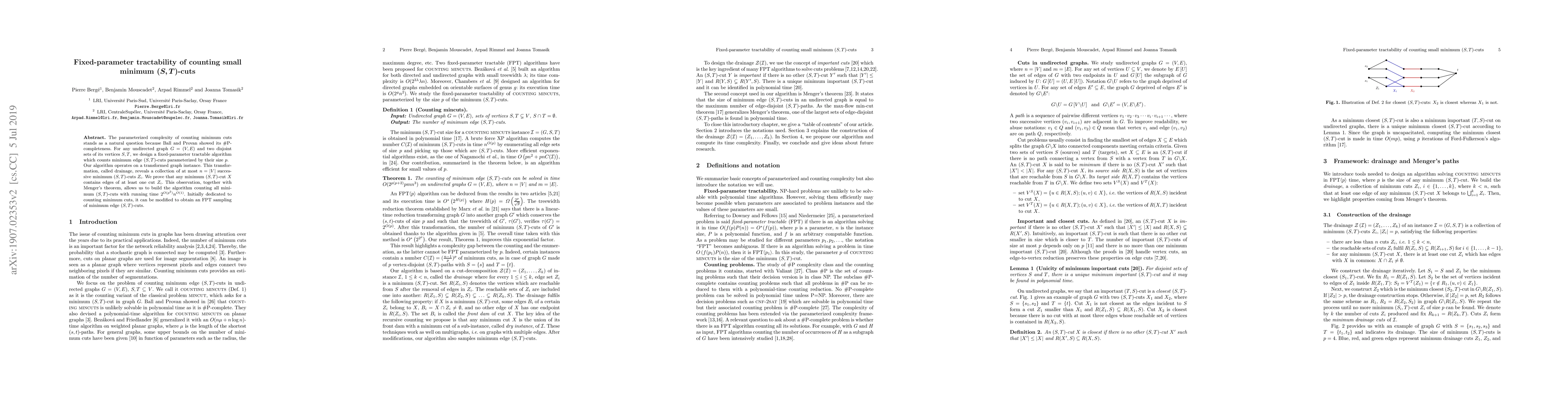 The parameterized complexity of counting minimum cuts stands as a natural question because Ball and Provan showed its #P-completeness. For any undirected graph $G=(V,E)$ and two disjoint sets of its vertices $S,T$, we design a fixed-parameter tractable algorithm which counts minimum edge $(S,T)$-cuts parameterized by their size $p$. Our algorithm operates on a transformed graph instance. This transformation, called drainage, reveals a collection of at most $n=\left| V \right|$ successive minimum $(S,T)$-cuts $Z_i$. We prove that any minimum $(S,T)$-cut $X$ contains edges of at least one cut $Z_i$. This observation, together with Menger's theorem, allows us to build the algorithm counting all minimum $(S,T)$-cuts with running time $2^{O(p^2)}n^{O(1)}$. Initially dedicated to counting minimum cuts, it can be modified to obtain an FPT sampling of minimum edge $(S,T)$-cuts.