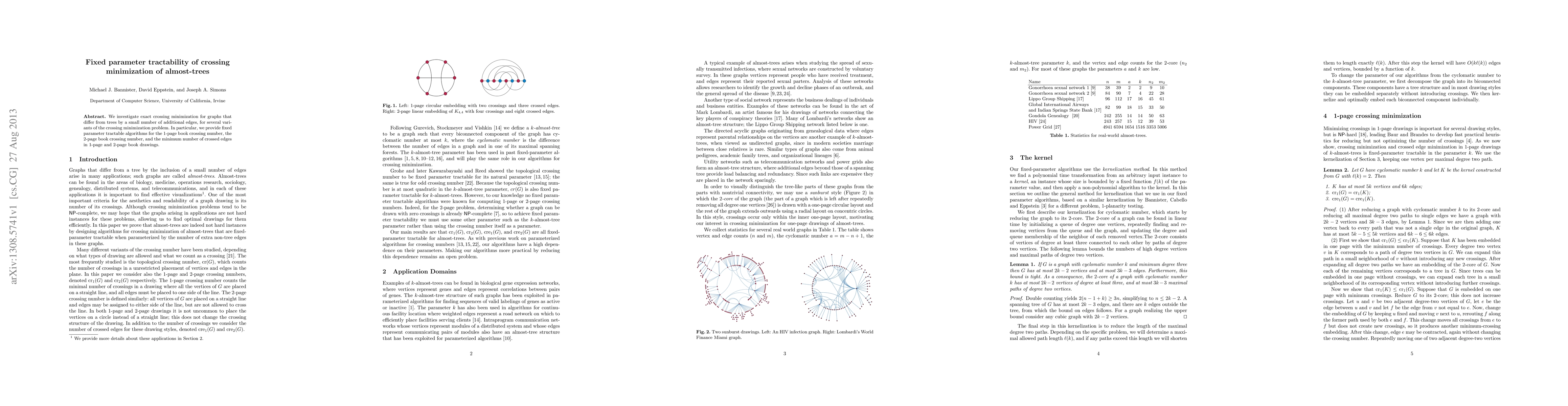 This paper explores the fixed parameter tractability of crossing minimization in almost-trees, providing efficient algorithms for minimizing crossings in 1-page and 2-page book drawings. It focuses on the 1-page and 2-page book crossing numbers, as well as the minimum number of crossed edges.