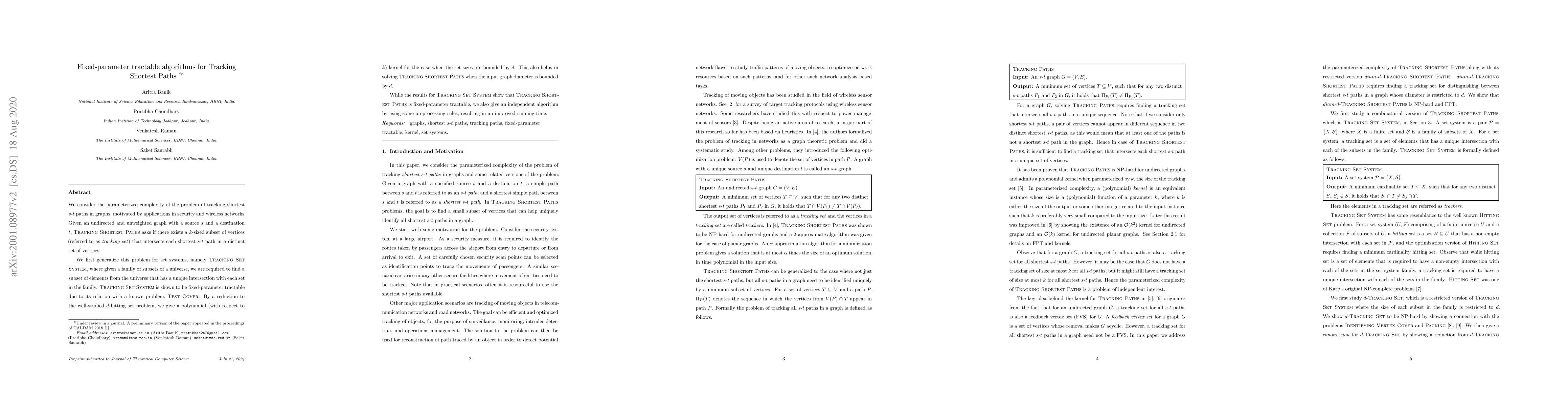 This paper explores fixed-parameter tractable algorithms for tracking shortest paths in graphs, addressing the problem of finding a k-sized tracking set that intersects each shortest path uniquely. It demonstrates the problem's tractability through a reduction to the d-hitting set problem and provides an independent algorithm with improved running time.