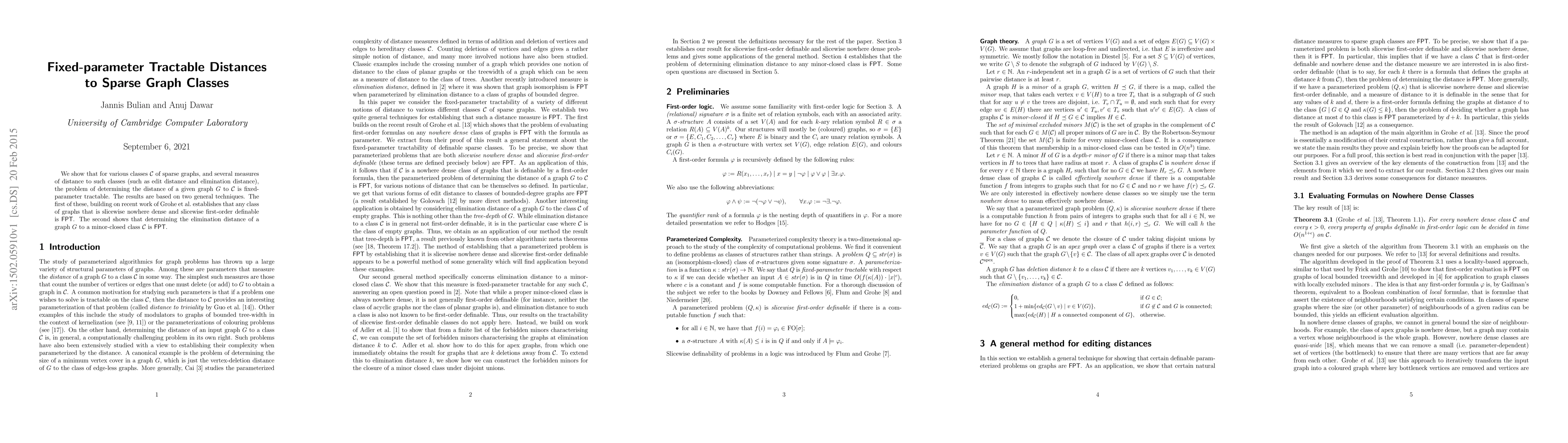 The paper presents a fixed-parameter tractable (FPT) algorithm for determining distances to sparse graph classes using techniques based on nowhere denseness and elimination distance, leveraging results from Grohe et al.