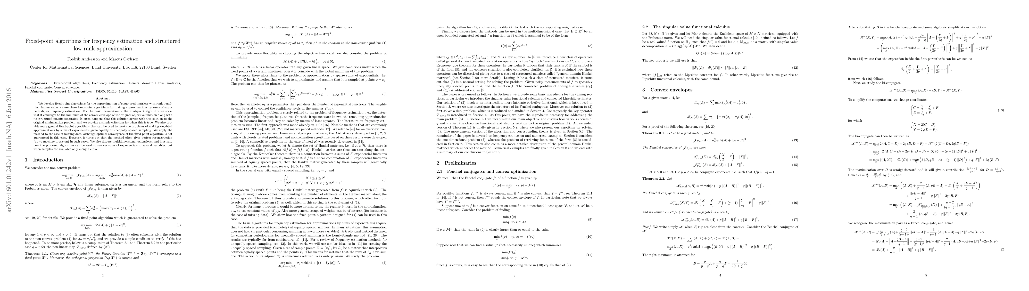 This paper develops fixed-point algorithms for approximating structured matrices with rank penalties, particularly for frequency estimation by sums of exponentials. The algorithms converge to the minimum of the convex envelope of the objective function under structured constraints, often matching the original minimization problem.