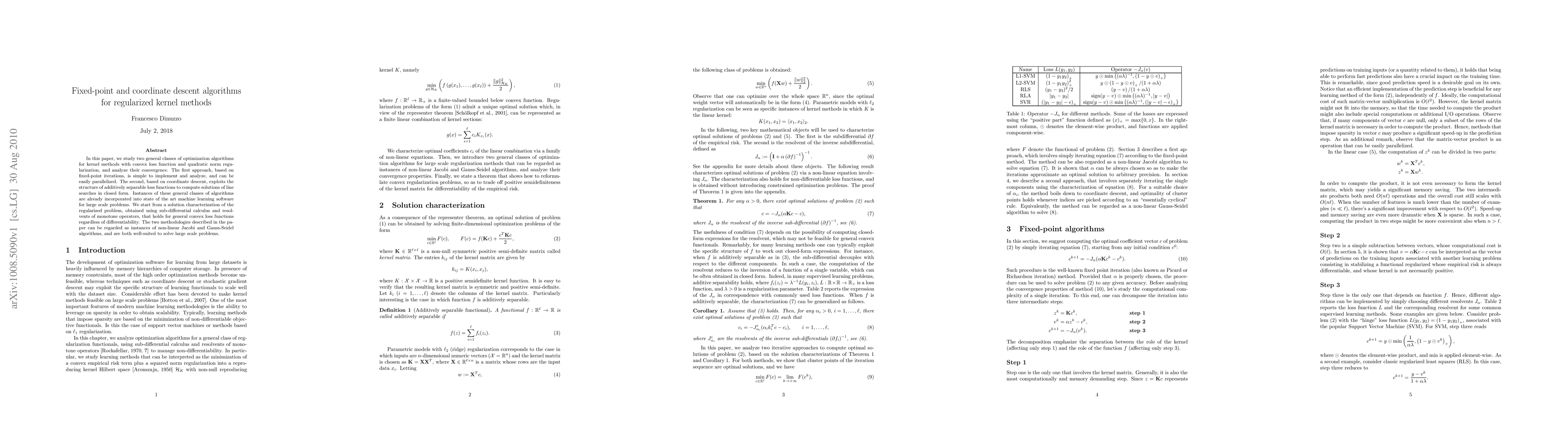 This paper investigates two optimization algorithms for regularized kernel methods: a fixed-point iteration approach and a coordinate descent method. Both algorithms are analyzed for convergence and are suitable for large-scale problems, with the fixed-point method being easily parallelizable and the coordinate descent method leveraging additively separable loss functions.