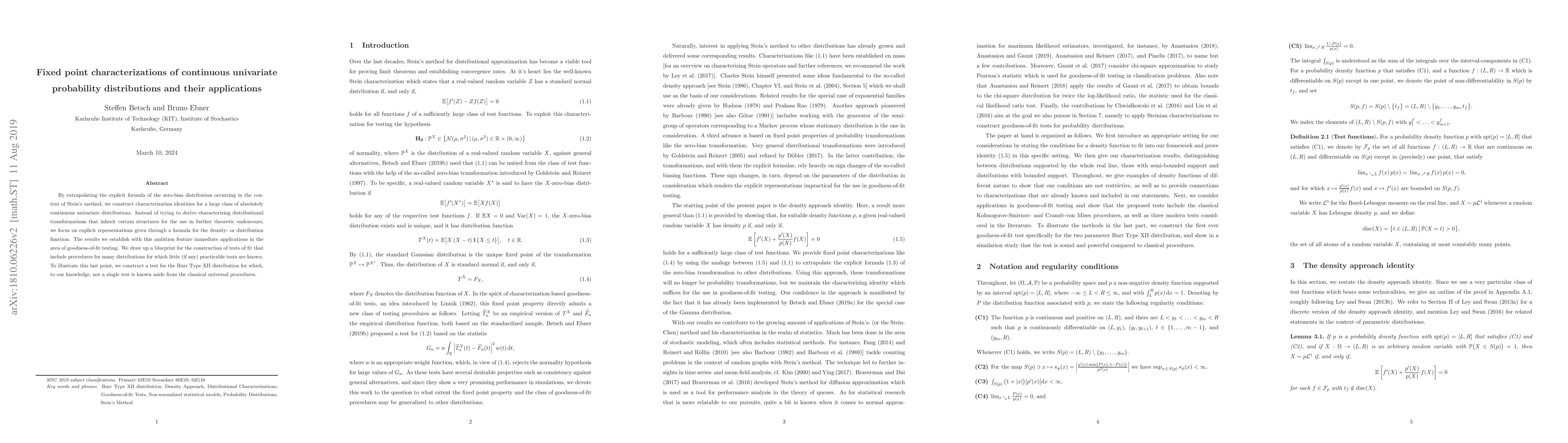 By extrapolating the explicit formula of the zero-bias distribution occurring in the context of Stein's method, we construct characterization identities for a large class of absolutely continuous univariate distributions. Instead of trying to derive characterizing distributional transformations that inherit certain structures for the use in further theoretic endeavours, we focus on explicit representations given through a formula for the density- or distribution function. The results we establish with this ambition feature immediate applications in the area of goodness-of-fit testing. We draw up a blueprint for the construction of tests of fit that include procedures for many distributions for which little (if any) practicable tests are known. To illustrate this last point, we construct a test for the Burr Type XII distribution for which, to our knowledge, not a single test is known aside from the classical universal procedures.