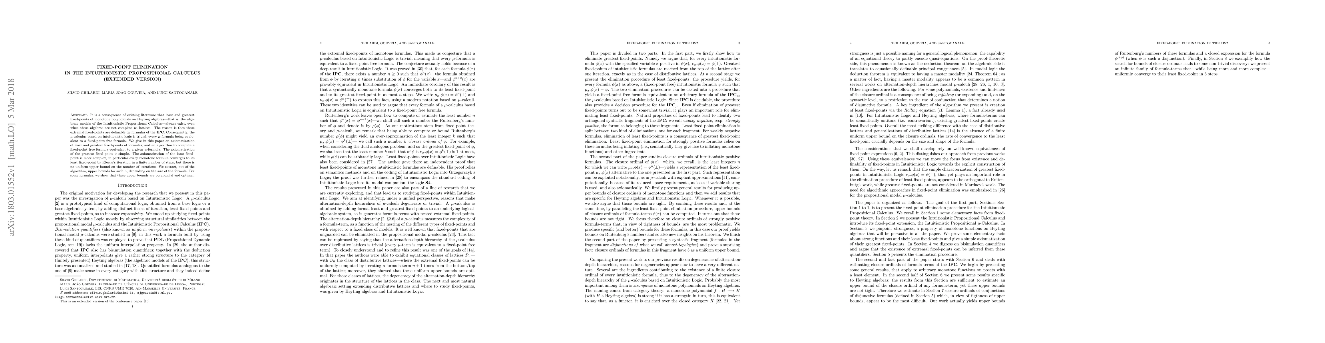 This paper presents an axiomatization and algorithm for eliminating fixed-points in Intuitionistic Propositional Calculus, showing that every $\mu$-formula can be transformed into a fixed-point free equivalent. The greatest fixed-point is straightforward, while the least fixed-point involves complex axiomatization and variable iteration steps, with polynomial and optimal bounds derived for certain formulas.