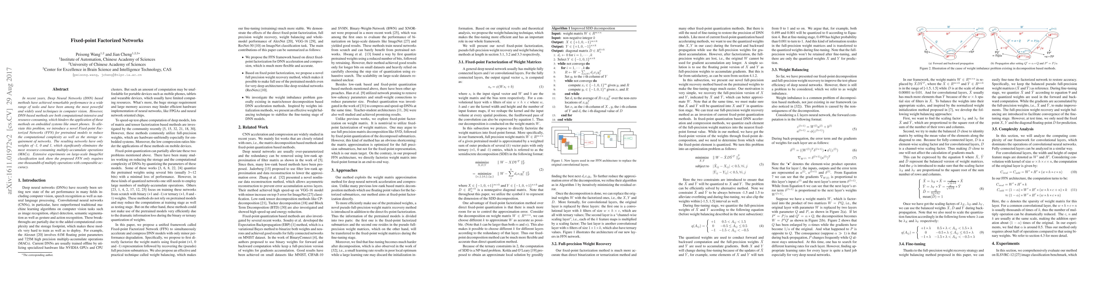 In recent years, Deep Neural Networks (DNN) based methods have achieved remarkable performance in a wide range of tasks and have been among the most powerful and widely used techniques in computer vision. However, DNN-based methods are both computational-intensive and resource-consuming, which hinders the application of these methods on embedded systems like smart phones. To alleviate this problem, we introduce a novel Fixed-point Factorized Networks (FFN) for pretrained models to reduce the computational complexity as well as the storage requirement of networks. The resulting networks have only weights of -1, 0 and 1, which significantly eliminates the most resource-consuming multiply-accumulate operations (MACs). Extensive experiments on large-scale ImageNet classification task show the proposed FFN only requires one-thousandth of multiply operations with comparable accuracy.
