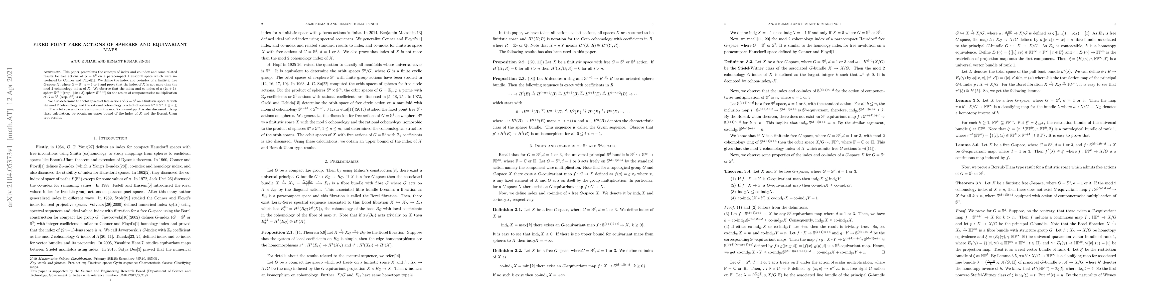 The paper generalizes index and co-index concepts for free actions of spheres on paracompact Hausdorff spaces, introducing new definitions and proving related results.