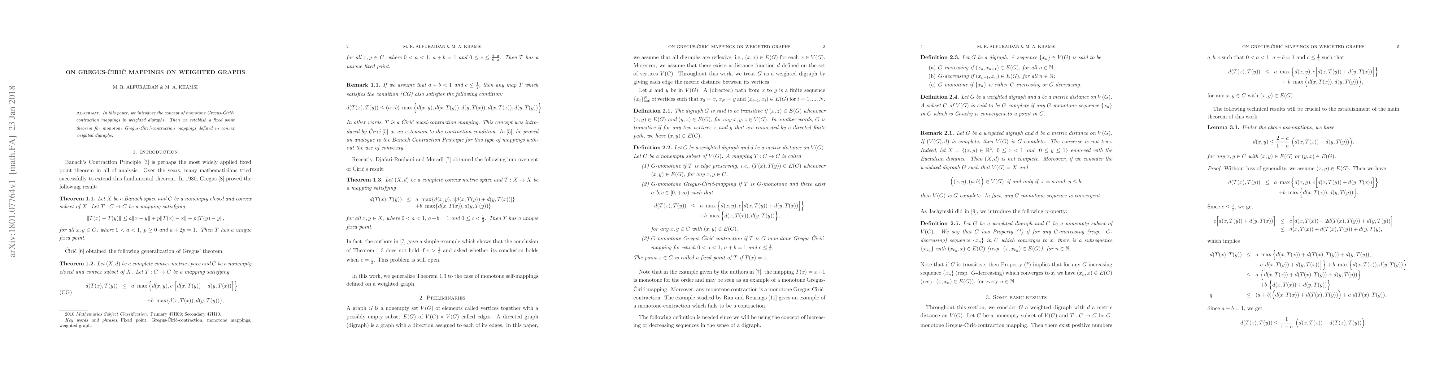 This paper introduces the concept of monotone Gregus-Cirić-contraction mappings in weighted digraphs and establishes a fixed point theorem for these mappings in convex weighted digraphs.