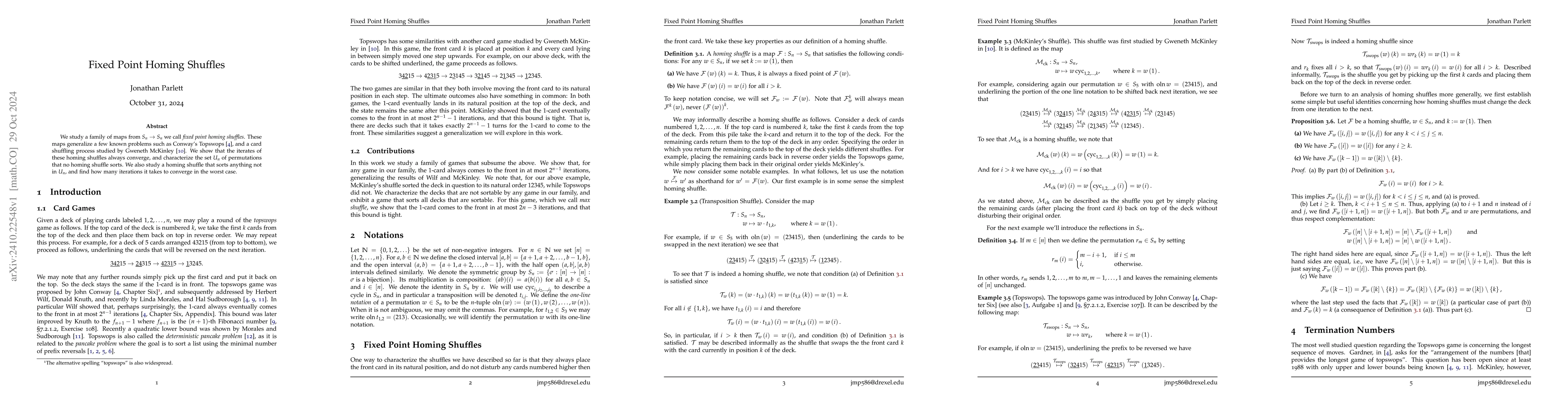 We study a family of maps from $S_n \to S_n$ we call fixed point homing shuffles. These maps generalize a few known problems such as Conway's Topswops, and a card shuffling process studied by Gweneth McKinley. We show that the iterates of these homing shuffles always converge, and characterize the set $U_n$ of permutations that no homing shuffle sorts. We also study a homing shuffle that sorts anything not in $U_n$, and find how many iterations it takes to converge in the worst case.