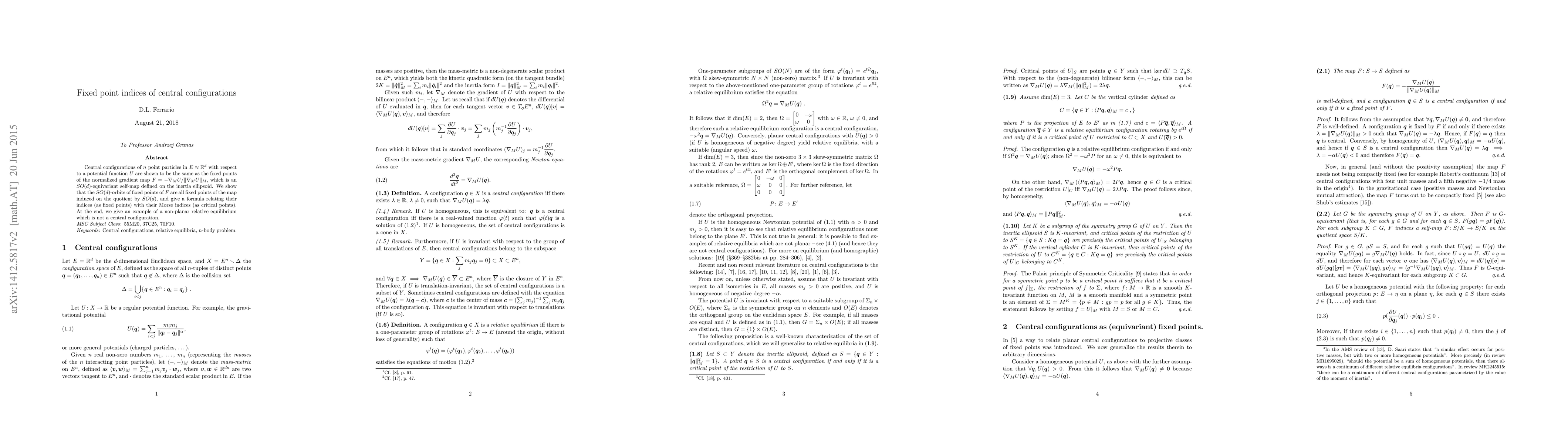 This paper identifies central configurations of point particles in $E \approx \mathbb{R}^d$ with fixed points of the normalized gradient map $F$. It demonstrates that $SO(d)$-equivariant orbits of these fixed points relate their indices to their Morse indices, and concludes with a non-planar relative equilibrium example that isn't a central configuration.
