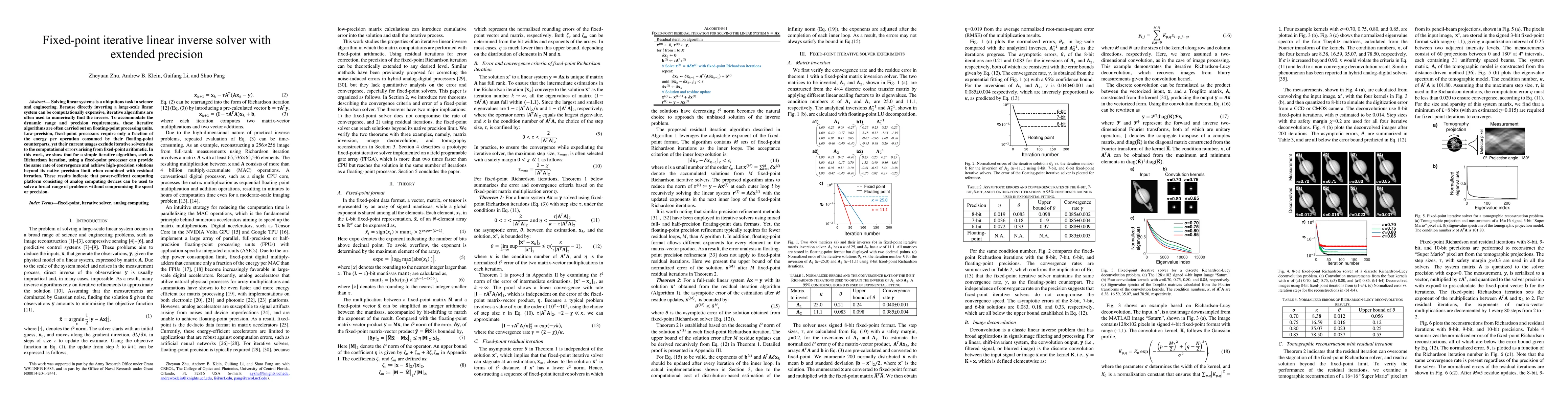 This paper proposes an iterative linear inverse solver using fixed-point arithmetic that achieves high precision beyond its native limit through residual iteration. It demonstrates that power-efficient, low-precision processors can solve large-scale linear systems with comparable convergence rates and precision to floating-point processors.