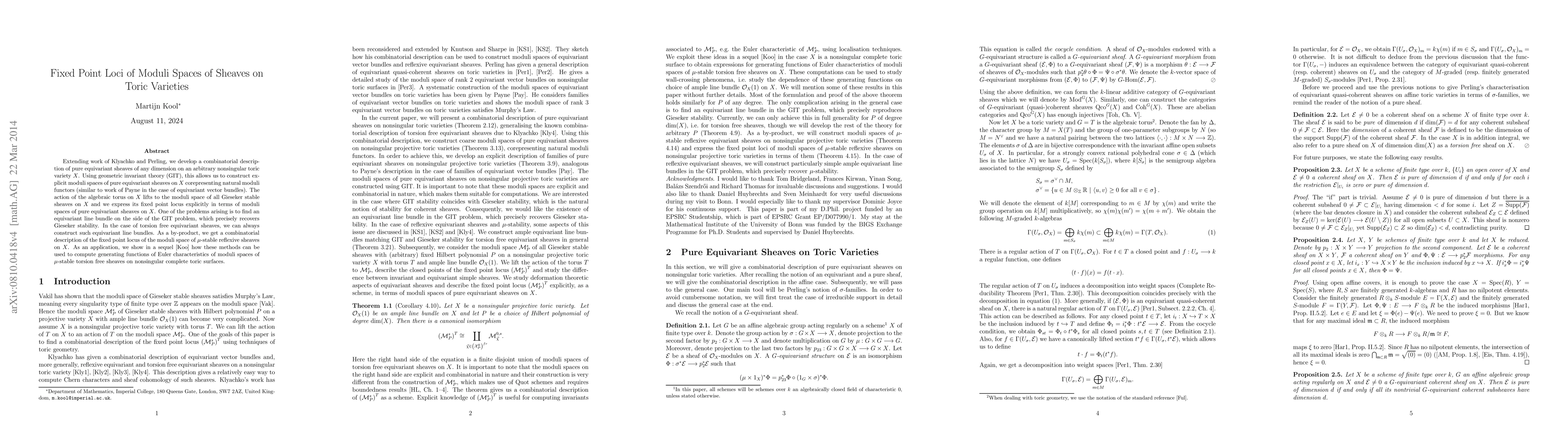 This paper develops a combinatorial framework to describe moduli spaces of pure equivariant sheaves on nonsingular toric varieties, constructing explicit moduli spaces via geometric invariant theory. It explicitly determines the fixed point loci of these moduli spaces and provides a combinatorial description of $\mu$-stable reflexive sheaves.