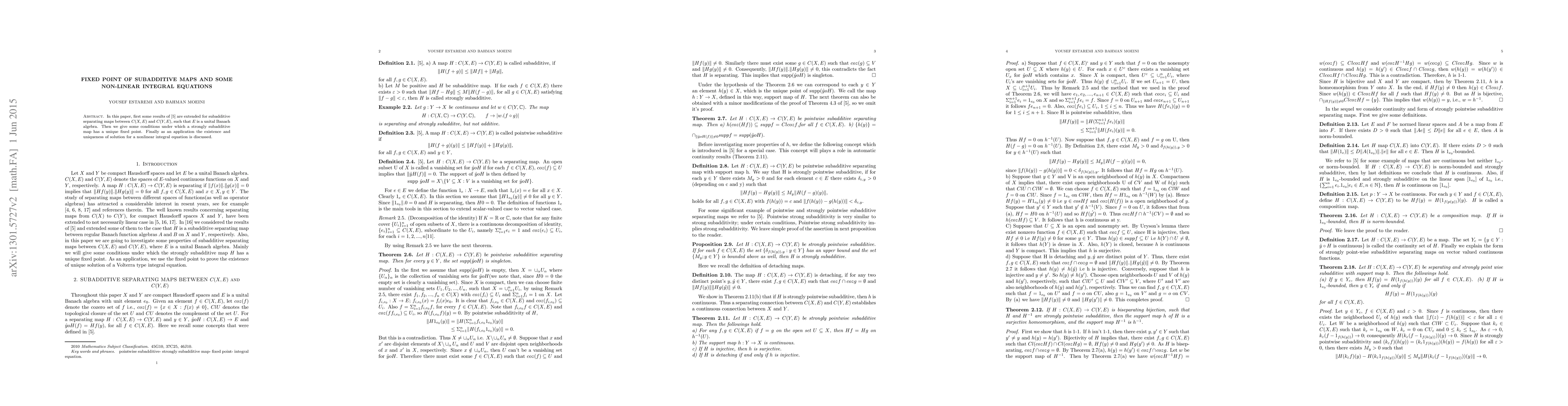 In this paper, first some results of [5] are extended for subadditive separating maps between C(X;E) and C(Y;E), such that E is a unital Banach algebra. Then we give some conditions under which a strongly subadditive map has a unique fixed point. Finally as an application the existence and uniqueness of solution for a nonlinear integral equation is discussed.