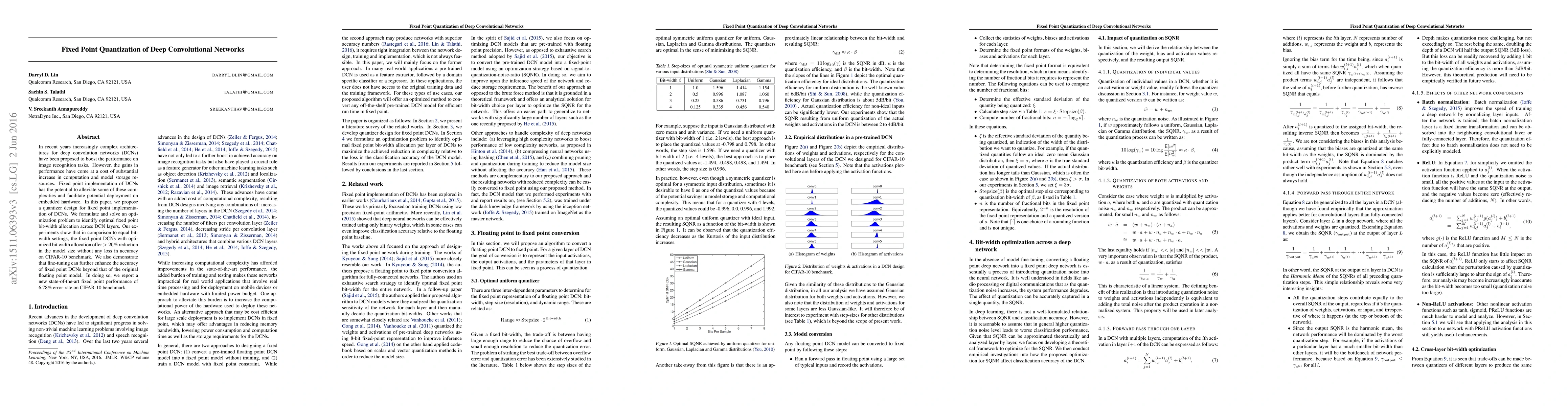 This paper proposes a fixed point quantization method for deep convolutional networks (DCNs) to reduce model size and resource requirements while maintaining accuracy. The authors optimize bit-width allocation across layers, achieving >20% reduction in model size without loss in accuracy on CIFAR-10, and report a new state-of-the-art fixed point error rate of 6.78%.