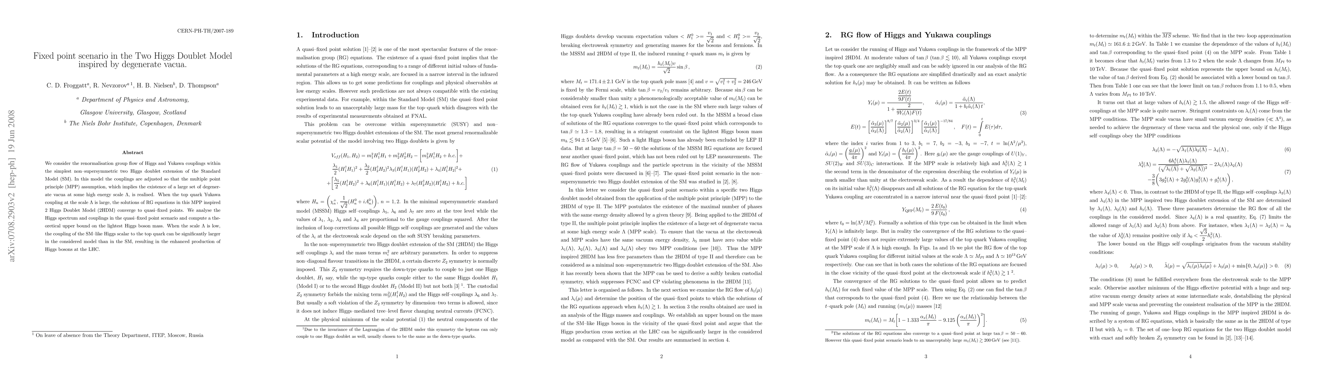 This paper explores the renormalization group flow in a non-supersymmetric two Higgs doublet model, focusing on the multiple point principle that leads to degenerate vacua. It reveals quasi-fixed points in the model, analyzes the Higgs spectrum, and computes an upper bound on the lightest Higgs boson mass, showing potential for enhanced Higgs production at the LHC.