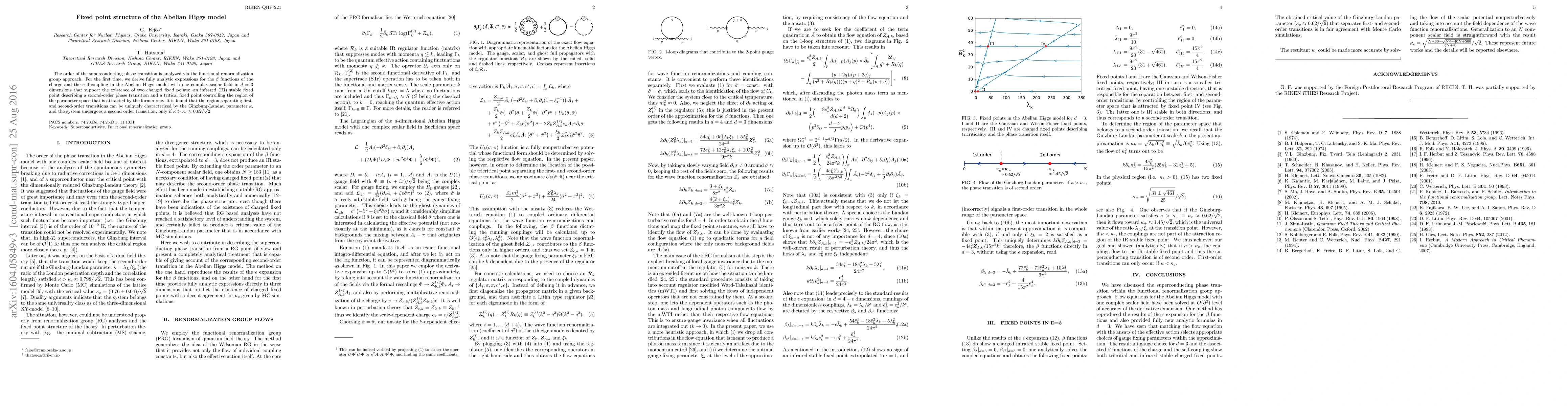 This paper uses the functional renormalization group to analyze the superconducting phase transition in the Abelian Higgs model, deriving analytic expressions for $\beta$ functions that reveal two charged fixed points. It concludes that a second-order transition occurs when the Ginzburg-Landau parameter $\kappa$ exceeds a critical value $\kappa_c \approx 0.62/\sqrt2$.