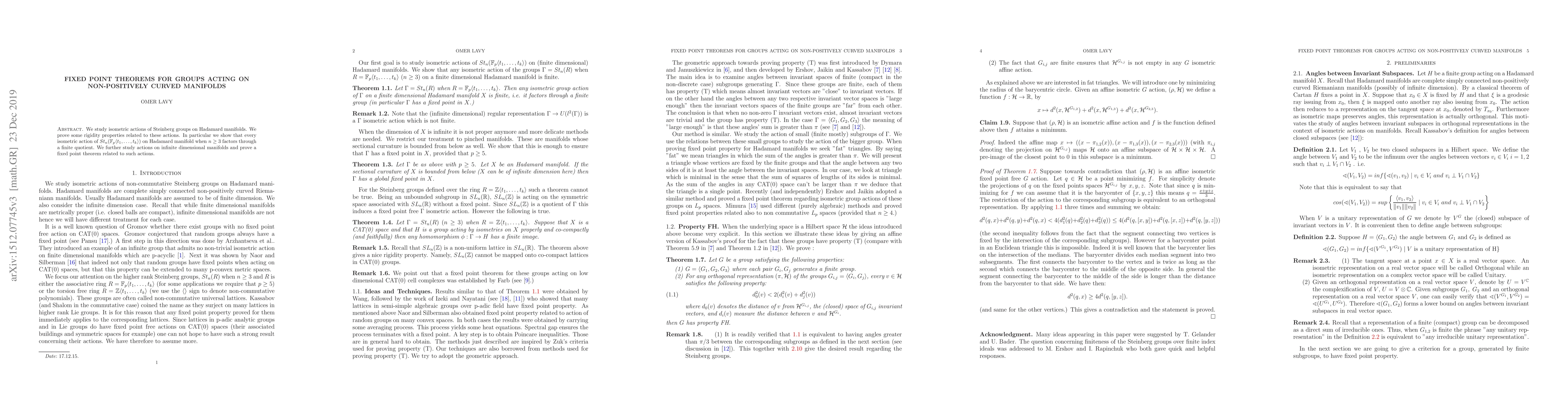 We study isometric actions of Steinberg groups on Hadamard manifolds. We prove some rigidity properties related to these actions. In Particular we show that every isometric action of $St_n(F_p\langle t_1,\ldots ,t_k \rangle)$ on Hadamard manifold when $n \geq 3$ is finite. We further study actions on infinite dimensional manifolds and prove a fixed point theorem related to such actions.