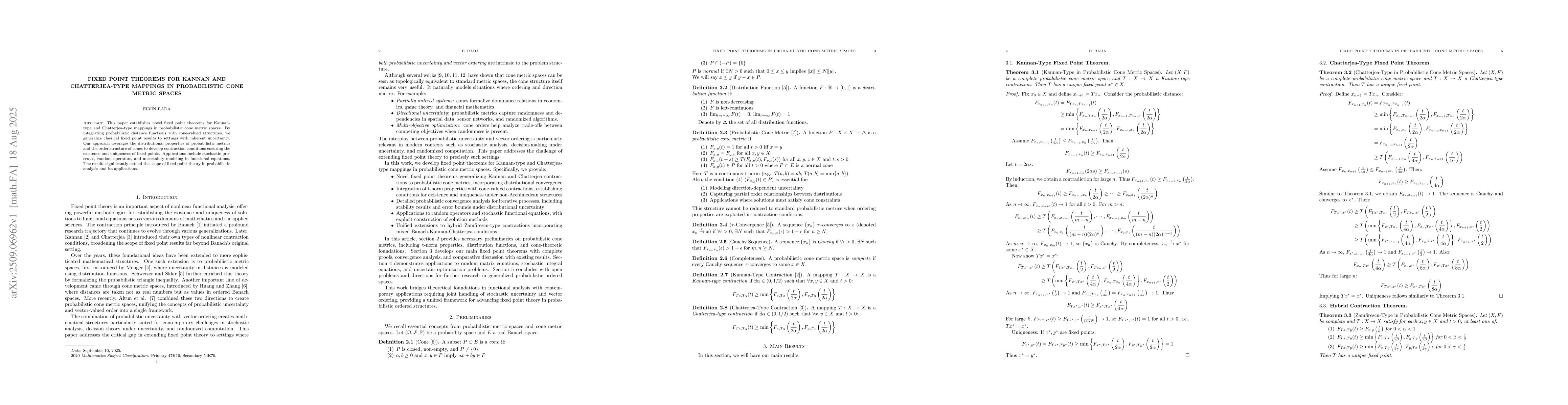 This paper establishes novel fixed point theorems for Kannan-type and Chatterjea-type mappings in probabilistic cone metric spaces. By integrating probabilistic distance functions with cone-valued structures, we generalize classical fixed point results to settings with inherent uncertainty. Our approach leverages the distributional properties of probabilistic metrics and the order structure of cones to develop contraction conditions ensuring the existence and uniqueness of fixed points. Applications include stochastic processes, random operators, and uncertainty modeling in functional equations. The results significantly extend the scope of fixed point theory in probabilistic analysis and its applications