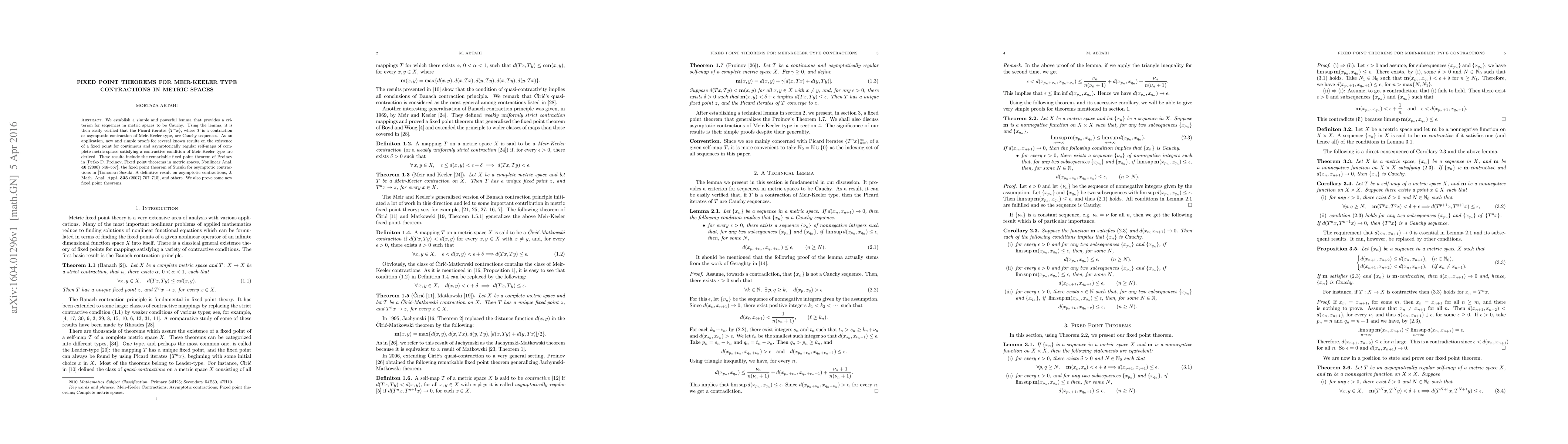 We establish a simple and powerful lemma that provides a criterion for sequences in metric spaces to be Cauchy. Using the lemma, it is then easily verified that the Picard iterates $\{T^nx\}$, where $T$ is a contraction or asymptotic contraction of Meir-Keeler type, are Cauchy sequences. As an application, new and simple proofs for several known results on the existence of a fixed point for continuous and asymptotically regular self-maps of complete metric spaces satisfying a contractive condition of Meir-Keeler type are derived. These results include the remarkable fixed point theorem of Proinov in [Petko D. Proinov, Fixed point theorems in metric spaces, Nonlinear Anal. \textbf{46} (2006) 546--557], the fixed point theorem of Suzuki for asymptotic contractions in [Tomonari Suzuki, A definitive result on asymptotic contractions, J. Math. Anal. Appl. \textbf{335} (2007) 707--715], and others. We also prove some new fixed point theorems.