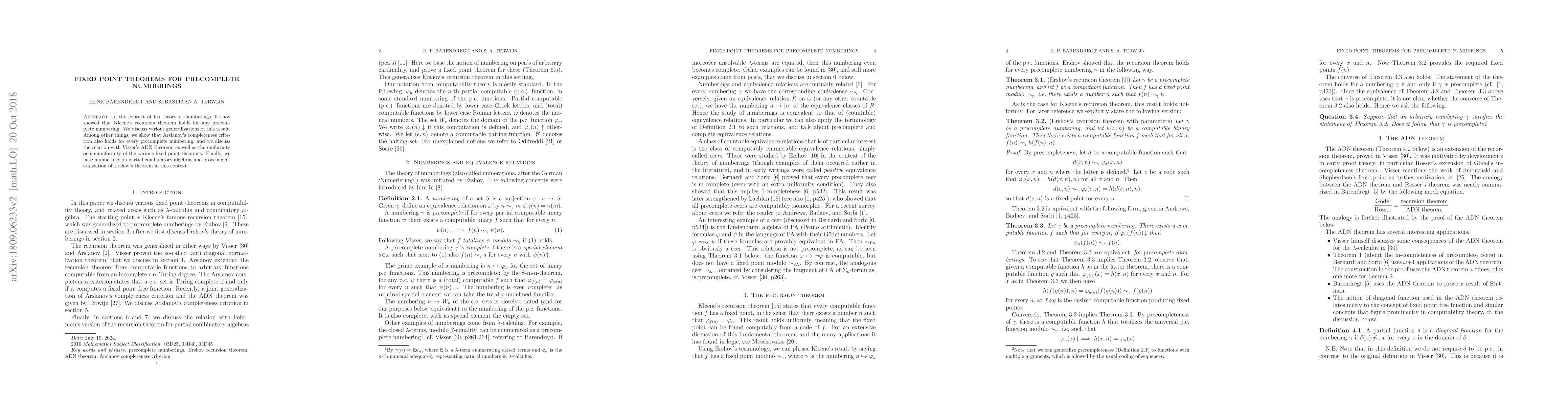 In the context of his theory of numberings, Ershov showed that Kleene's recursion theorem holds for any precomplete numbering. We discuss various generalizations of this result. Among other things, we show that Arslanov's completeness criterion also holds for every precomplete numbering, and we discuss the relation with Visser's ADN theorem, as well as the uniformity or nonuniformity of the various fixed point theorems. Finally, we base numberings on partial combinatory algebras and prove a generalization of Ershov's theorem in this context.
