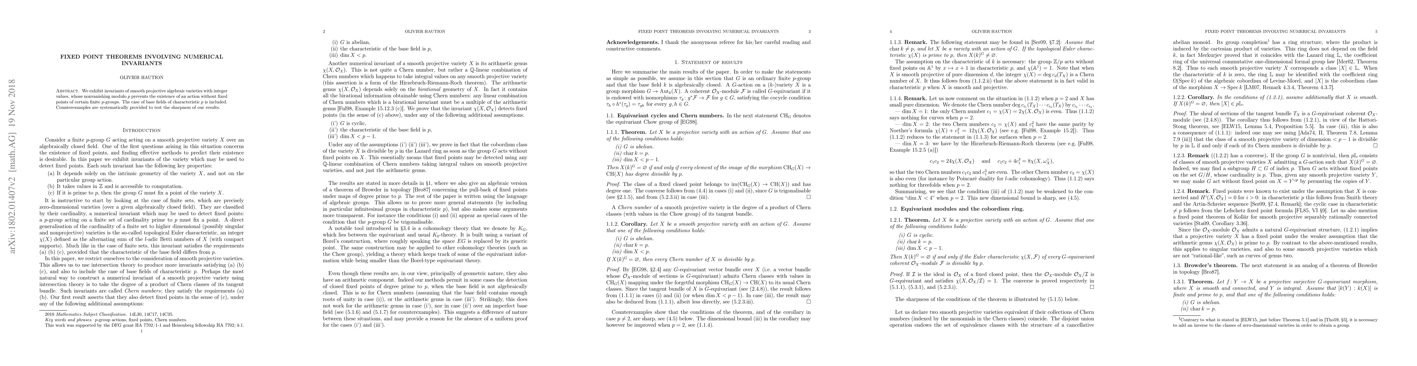 We exhibit invariants of smooth projective algebraic varieties with integer values, whose nonvanishing modulo p prevents the existence of an action without fixed points of certain finite p-groups. The case of base fields of characteristic p is included. Counterexamples are systematically provided to test the sharpness of our results.