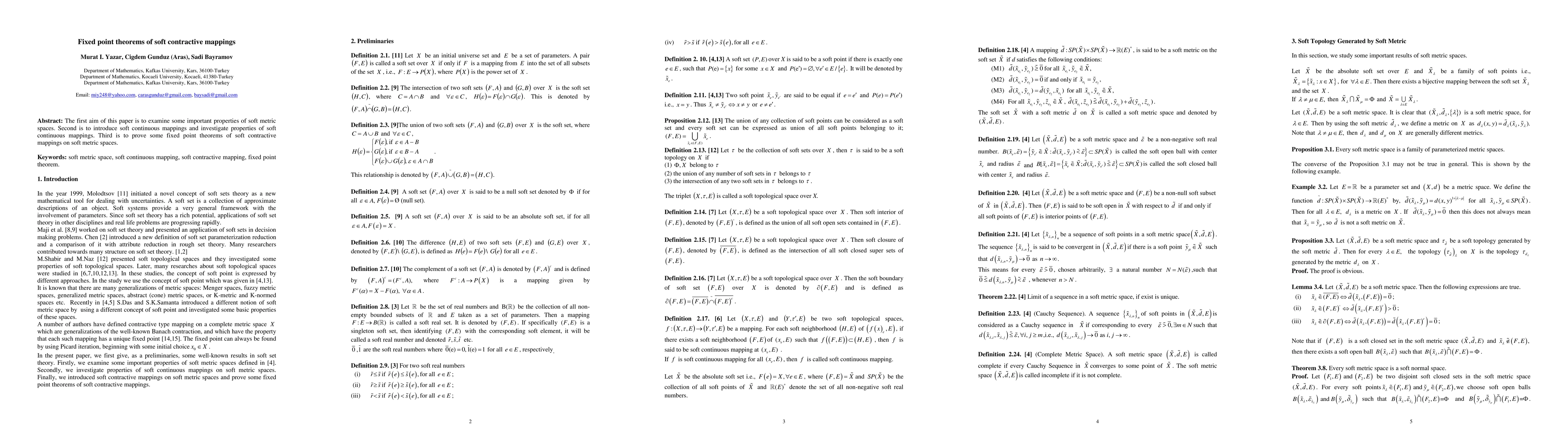 Summary: This paper explores the properties of soft metric spaces and soft continuous mappings, introduces soft contractive mappings, and proves several fixed point theorems for these mappings within soft metric spaces.