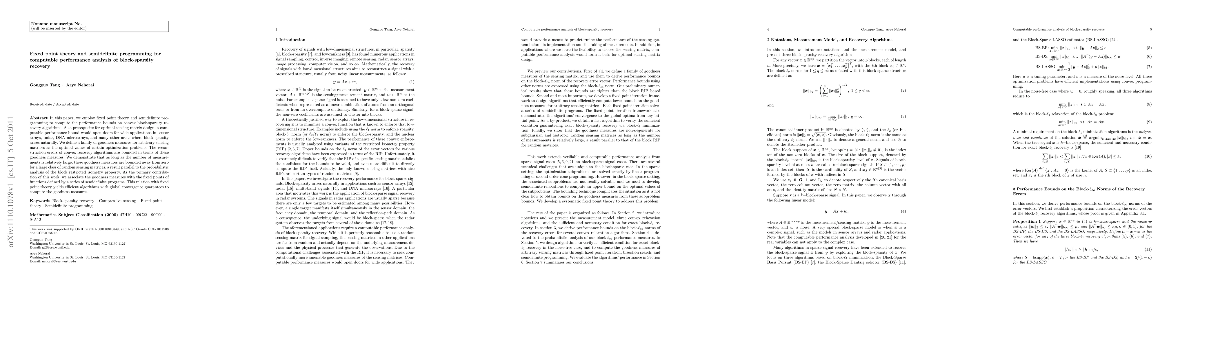 This paper uses fixed point theory and semidefinite programming to compute performance bounds for convex block-sparsity recovery algorithms, providing a computable performance measure essential for designing optimal sensing matrices in applications like sensor arrays and radar. The authors link these bounds to fixed points of semidefinite programs, enabling efficient computation with global convergence.