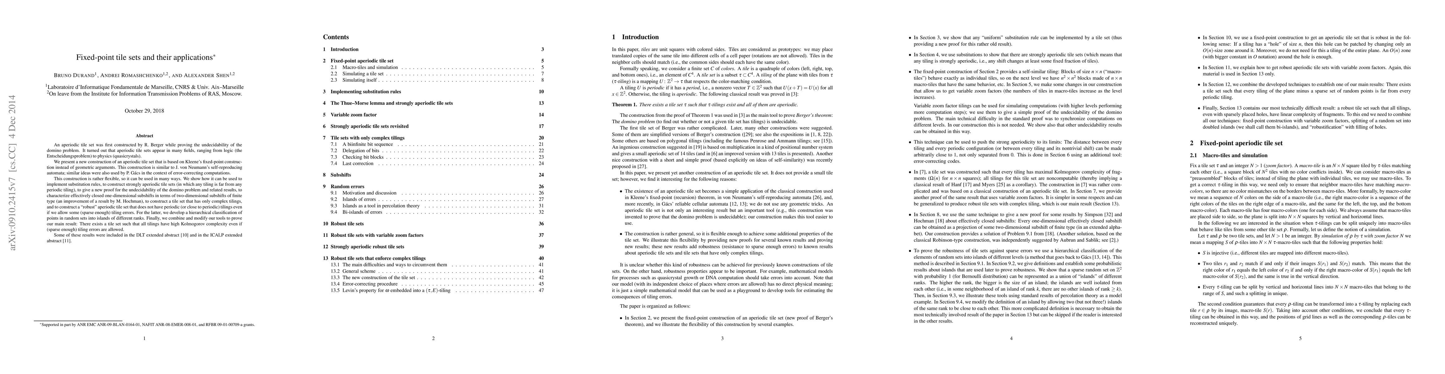 An aperiodic tile set was first constructed by R. Berger while proving the undecidability of the domino problem. It turned out that aperiodic tile sets appear in many topics ranging from logic (the Entscheidungsproblem) to physics (quasicrystals). We present a new construction of an aperiodic tile set that is based on Kleene's fixed-point construction instead of geometric arguments. This construction is similar to J. von Neumann self-reproducing automata; similar ideas were also used by P. Gacs in the context of error-correcting computations. This construction it rather flexible, so it can be used in many ways: we show how it can be used to implement substitution rules, to construct strongly aperiodic tile sets (any tiling is far from any periodic tiling), to give a new proof for the undecidability of the domino problem and related results, characterize effectively closed 1D subshift it terms of 2D shifts of finite type (improvement of a result by M. Hochman), to construct a tile set which has only complex tilings, and to construct a "robust" aperiodic tile set that does not have periodic (or close to periodic) tilings even if we allow some (sparse enough) tiling errors. For the latter we develop a hierarchical classification of points in random sets into islands of different ranks. Finally, we combine and modify our tools to prove our main result: there exists a tile set such that all tilings have high Kolmogorov complexity even if (sparse enough) tiling errors are allowed.