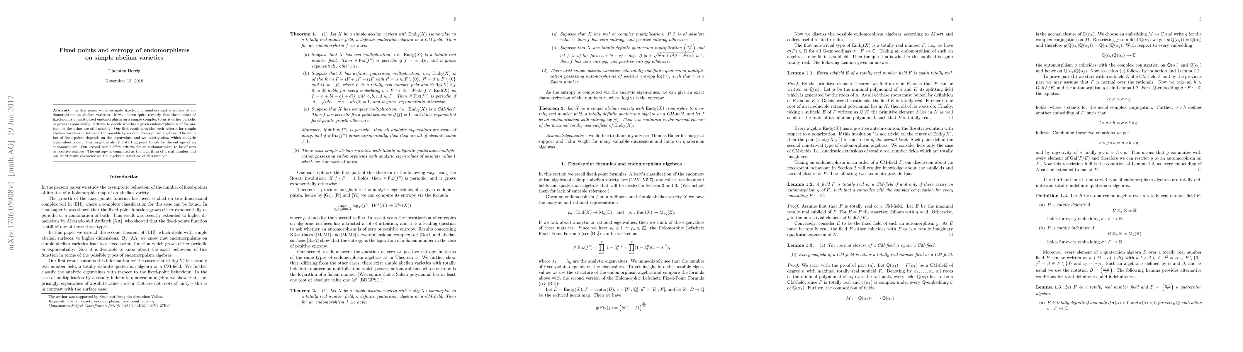 In this paper we investigate fixed-point numbers and entropies of endomorphisms on abelian varieties. It was shown quite recently that the number of fixed-points of an iterated endomorphism on a simple complex torus is either periodic or grows exponentially. Criteria to decide whether a given endomorphism is of the one type or the other are still missing. Our first result provides such criteria for simple abelian varieties in terms of the possible types of endomorphism algebras. The number of fixed-points depends on the eigenvalues and we exactly show which analytic eigenvalues occur. This insight is also the starting point to ask for the entropy of an endomorphism. Our second result offers criteria for an endomorphism to be of zero or positive entropy. The entropy is computed as the logarithm of a real number and our third result characterizes the algebraic structure of this number.