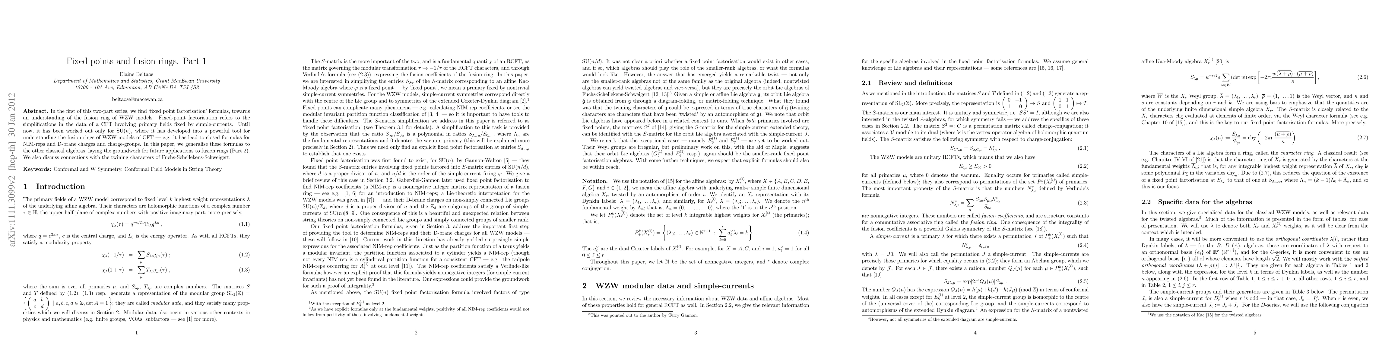 In the first of this two-part series, we find `fixed point factorisation' formulas, towards an understanding of the fusion ring of WZW models. Fixed-point factorisation refers to the simplifications in the data of a CFT involving primary fields fixed by simple-currents. Until now, it has been worked out only for SU(n), where it has developed into a powerful tool for understanding the fusion rings of WZW models of CFT -- e.g. it has lead to closed formulas for NIM-reps and D-brane charges and charge-groups. In this paper, we generalise these formulas to the other classical algebras, laying the groundwork for future applications to fusion rings (Part 2). We also discuss connections with the twining characters of Fuchs-Schellekens-Schweigert.