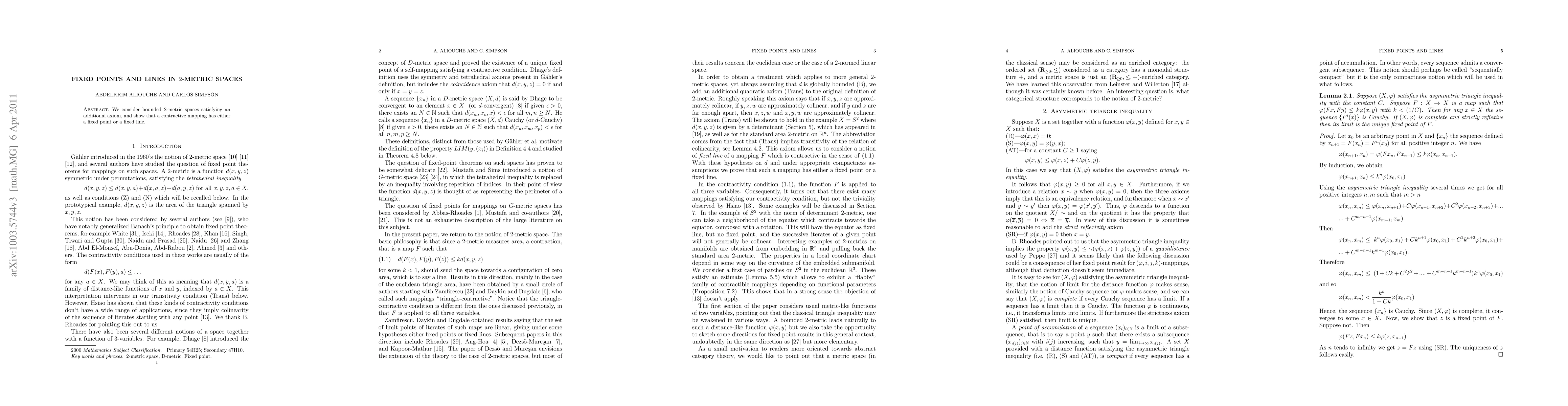 We consider bounded 2-metric spaces satisfying an additional axiom, and show that a contractive mapping has either a fixed point or a fixed line.