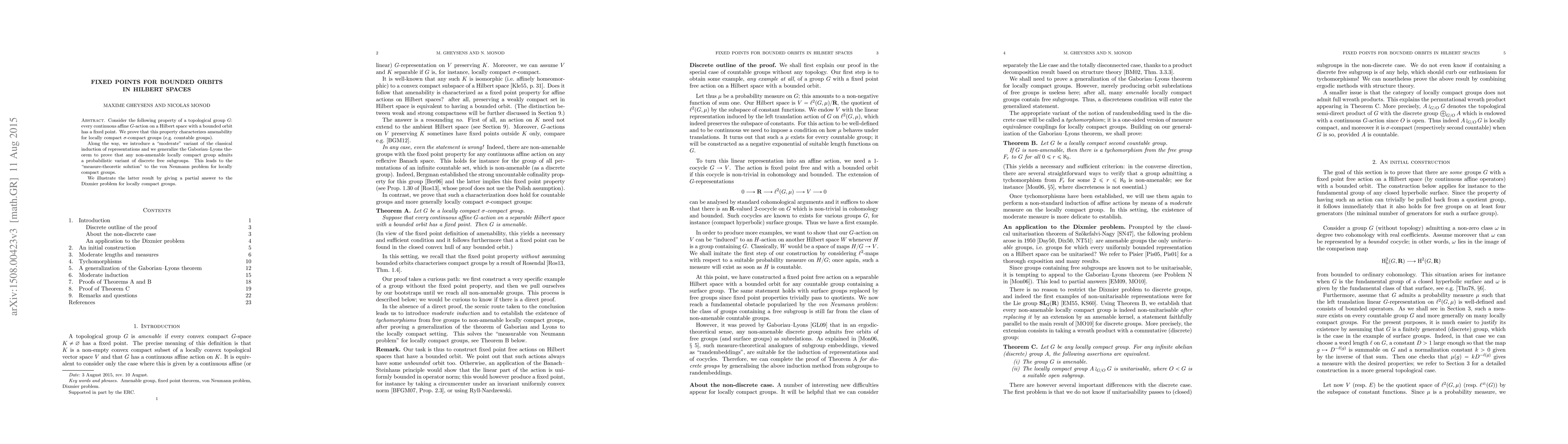 Consider the following property of a topological group G: every continuous affine G-action on a Hilbert space with a bounded orbit has a fixed point. We prove that this property characterizes amenability for locally compact sigma-compact groups (e.g. countable groups). Along the way, we introduce a "moderate" variant of the classical induction of representations and we generalize the Gaboriau--Lyons theorem to prove that any non-amenable locally compact group admits a probabilistic variant of discrete free subgroups. This leads to the "measure-theoretic solution" to the von Neumann problem for locally compact groups. We illustrate the latter result by giving a partial answer to the Dixmier problem for locally compact groups.