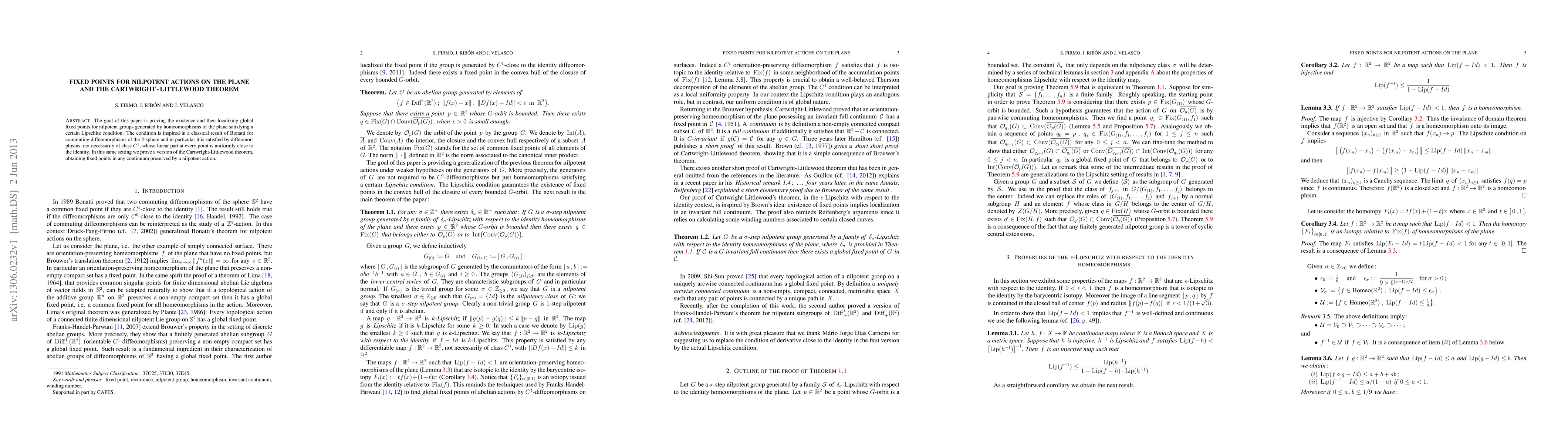 This paper proves the existence and localization of global fixed points for nilpotent group actions on the plane, fulfilling a Lipschitz condition inspired by Bonatti's theorem. It also establishes a version of the Cartwright-Littlewood theorem, guaranteeing fixed points within any continuum invariant under such nilpotent actions.