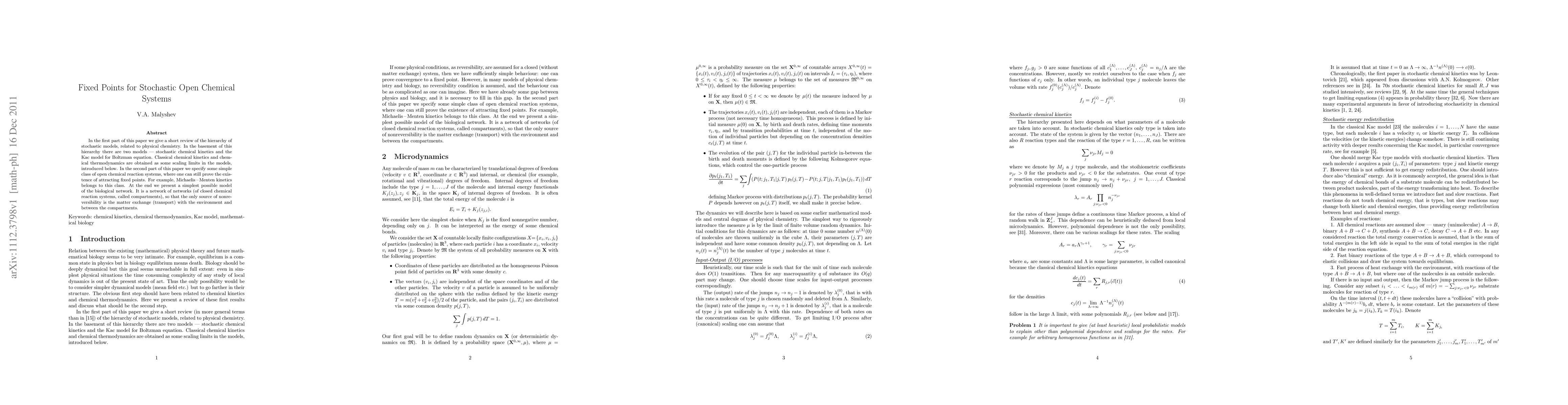 In the first part of this paper we give a short review of the hierarchy of stochastic models, related to physical chemistry. In the basement of this hierarchy there are two models --- stochastic chemical kinetics and the Kac model for Boltzman equation. Classical chemical kinetics and chemical thermodynamics are obtained as some scaling limits in the models, introduced below. In the second part of this paper we specify some simple class of open chemical reaction systems, where one can still prove the existence of attracting fixed points. For example, Michaelis\tire Menten kinetics belongs to this class. At the end we present a simplest possible model of the biological network. It is a network of networks (of closed chemical reaction systems, called compartments), so that the only source of nonreversibility is the matter exchange (transport) with the environment and between the compartments. Keywords: chemical kinetics, chemical thermodynamics, Kac model, mathematical biology