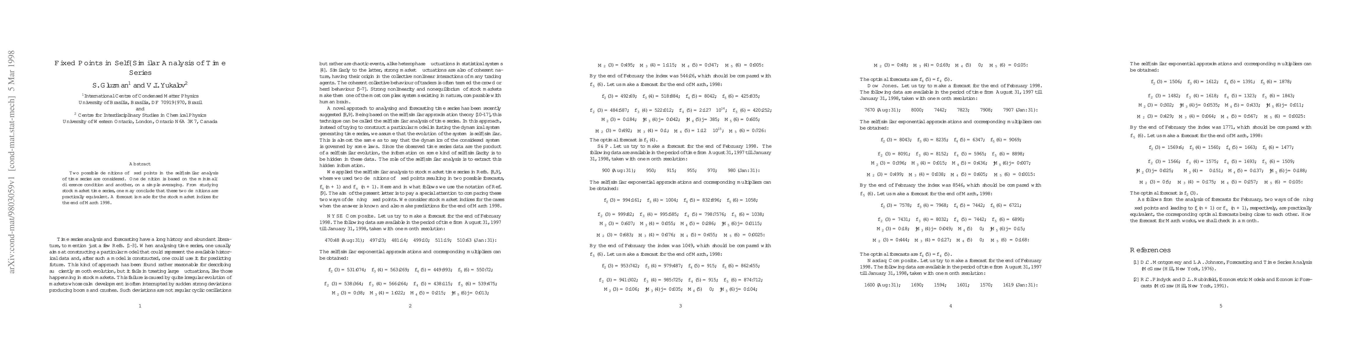 This paper explores two definitions of fixed points in self-similar time series analysis, finding them practically equivalent through stock market data. A forecast for stock market indices is provided for the end of March 1998.