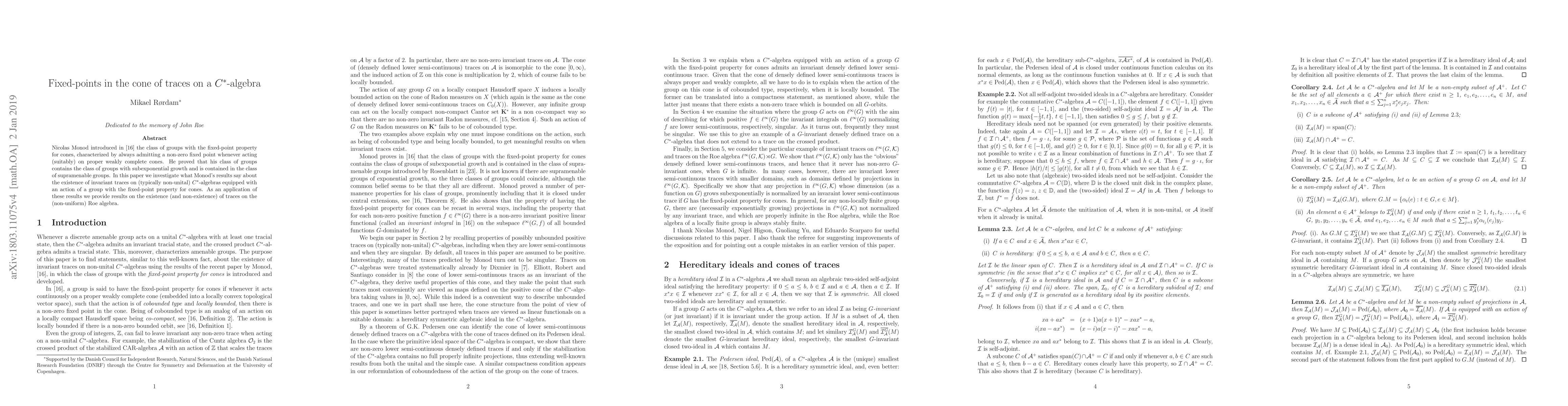 Nicolas Monod introduced the class of groups with the fixed-point property for cones, characterized by always admitting a non-zero fixed point whenever acting (suitably) on proper weakly complete cones. He proved that his class of groups contains the class of groups with subexponential growth and is contained in the class of supramenable groups. In this paper we investigate what Monod's results say about the existence of invariant traces on (typically non-unital) C*-algebras equipped with an action of a group with the fixed-point property for cones. As an application of these results we provide results on the existence (and non-existence) of traces on the (non-uniform) Roe algebra.