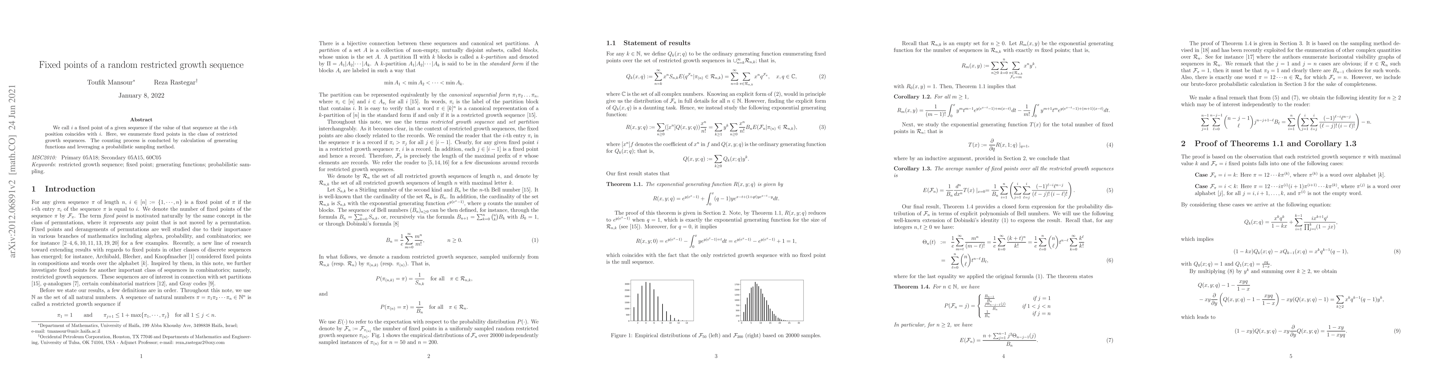 This paper explores fixed points in restricted growth sequences, defining them as positions where the sequence's value matches the position index. The study uses generating functions and probabilistic sampling to count these fixed points, presenting a methodological approach with implications for understanding sequence patterns.