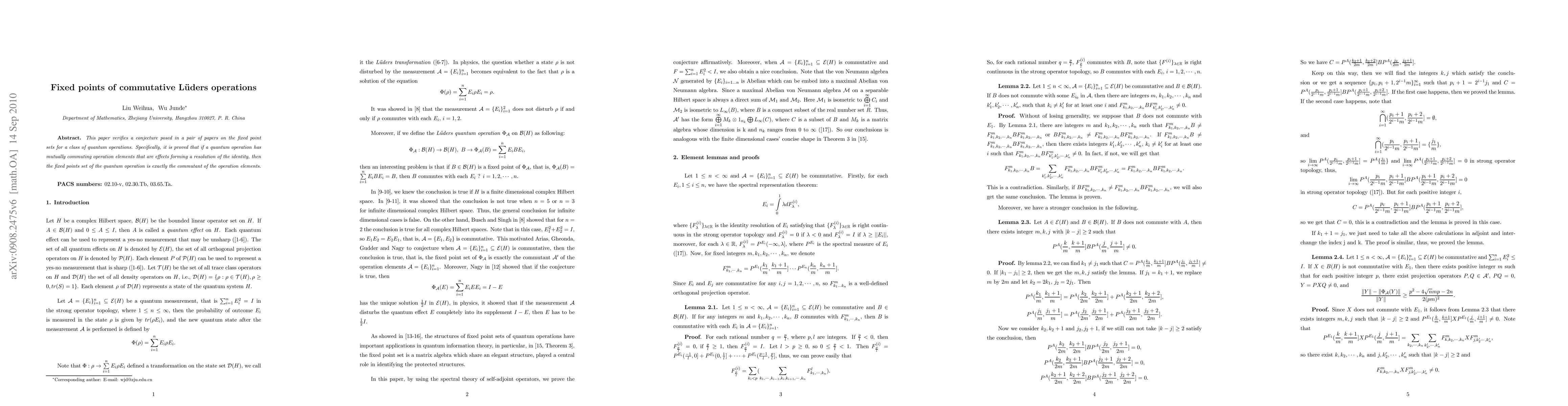This paper verifies a conjecture posed in a pair of papers on the fixed point sets for a class of quantum operations. Specifically, it is proved that if a quantum operation has mutually commuting operation elements that are effects forming a resolution of the identity, then the fixed points set of the quantum operation is exactly the commutant of the operation elements.