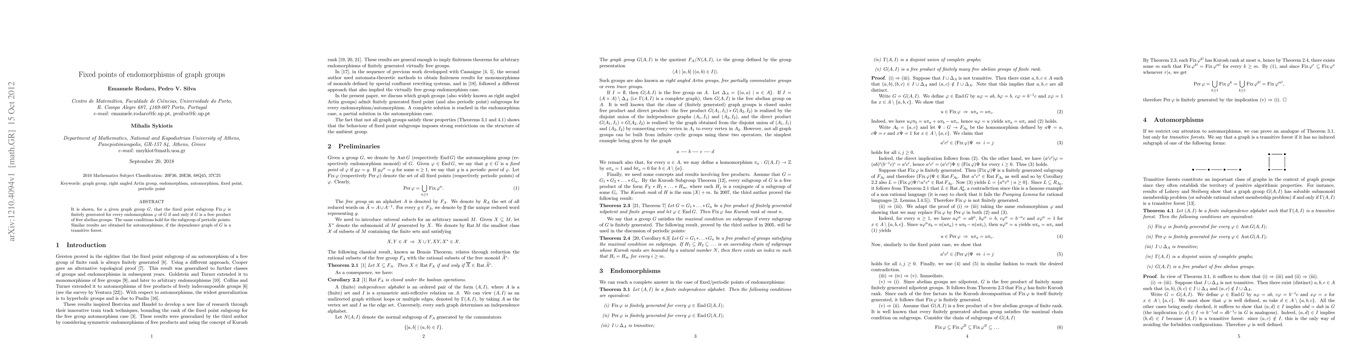 It is shown, for a given graph group $G$, that the fixed point subgroup Fix$\,\varphi$ is finitely generated for every endomorphism $\varphi$ of $G$ if and only if $G$ is a free product of free abelian groups. The same conditions hold for the subgroup of periodic points. Similar results are obtained for automorphisms, if the dependence graph of $G$ is a transitive forest.