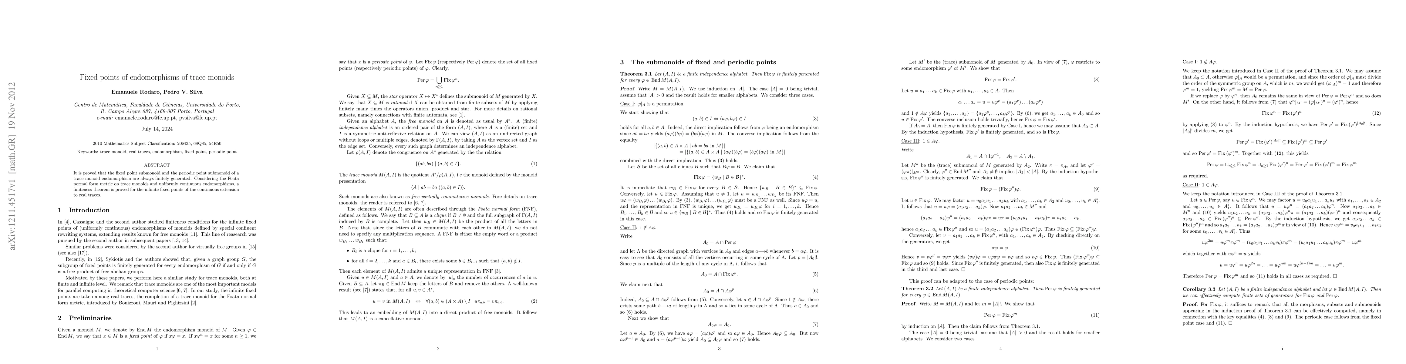 The paper proves that fixed and periodic point submonoids of trace monoid endomorphisms are finitely generated. It also establishes a finiteness theorem for infinite fixed points under continuous extensions to real traces using the Foata normal form metric.