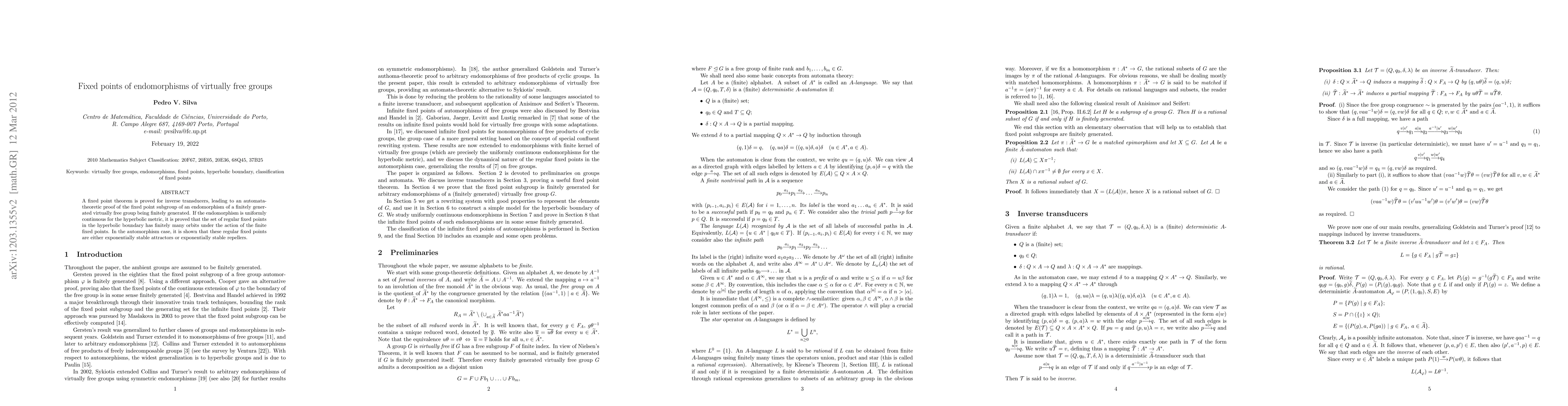 A fixed point theorem is proved for inverse transducers, leading to an automata-theoretic proof of the fixed point subgroup of an endomorphism of a finitely generated virtually free group being finitely generated. If the endomorphism is uniformly continuous for the hyperbolic metric, it is proved that the set of regular fixed points in the hyperbolic boundary has finitely many orbits under the action of the finite fixed points. In the automorphism case, it is shown that these regular fixed points are either exponentially stable attractors or exponentially stable repellers.