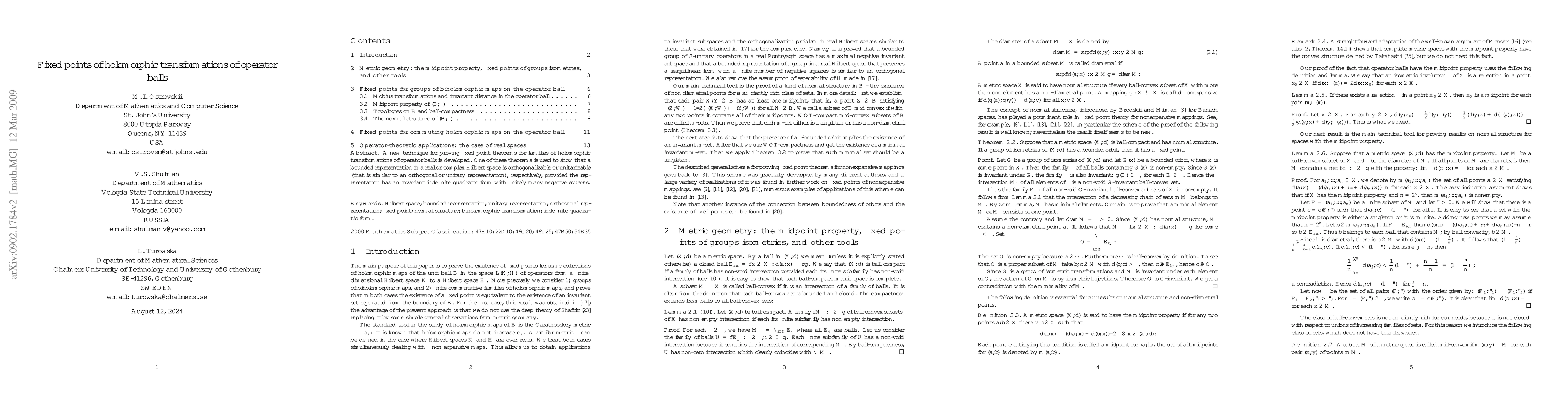 A new technique for proving fixed point theorems for families of holomorphic transformations of operator balls is developed. One of these theorems is used to show that a bounded representation in a real or complex Hilbert space is orthogonalizable or unitarizable (that is similar to an orthogonal or unitary representation), respectively, provided the representation has an invariant indefinite quadratic form with finitely many negative squares.