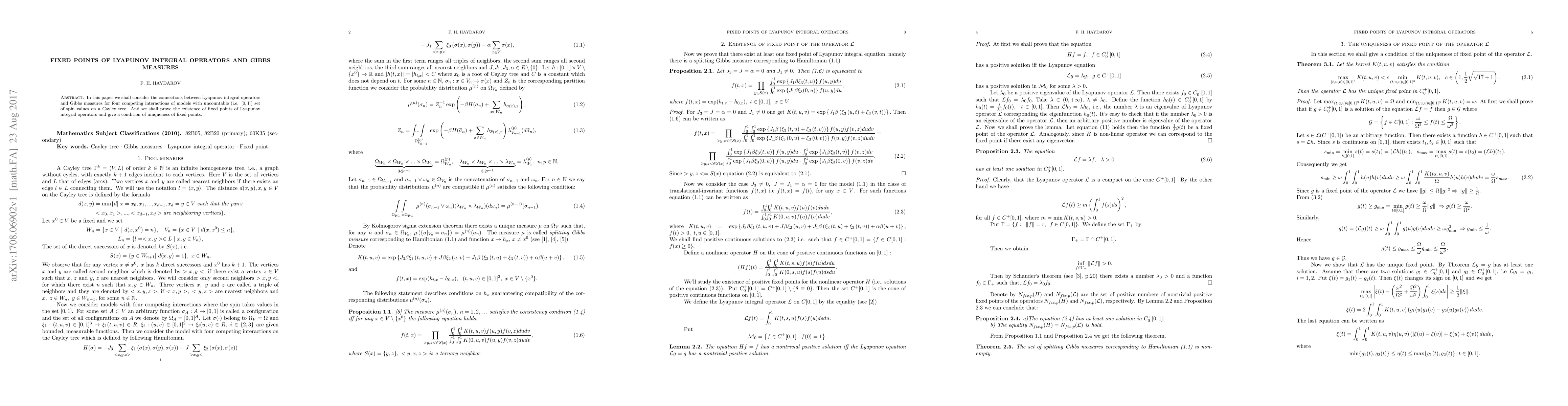 This paper explores the relationship between Lyapunov integral operators and Gibbs measures in models with four competing interactions on a Cayley tree, proving the existence and uniqueness of fixed points for operators under specific conditions.