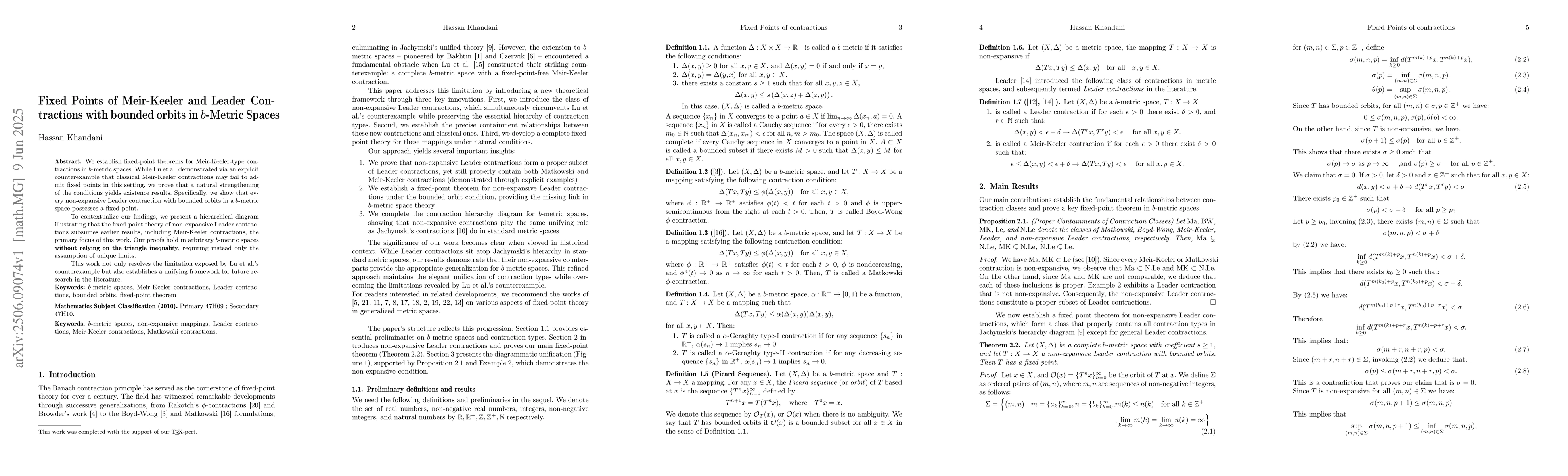 We establish fixed-point theorems for Meir-Keeler-type contractions in b-metric spaces. While Lu et al. demonstrated via an explicit counterexample that classical Meir-Keeler contractions may fail to admit fixed points in this setting, we prove that a natural strengthening of the conditions yields existence results. Specifically, we show that every non-expansive Leader contraction with bounded orbits in a b-metric space possesses a fixed point. To contextualize our findings, we present a hierarchical diagram illustrating that the fixed-point theory of non-expansive Leader contractions subsumes earlier results, including Meir-Keeler contractions, the primary focus of this work. Our proofs hold in arbitrary b-metric spaces, without relying on the triangle inequality, requiring instead only the assumption of unique limits. This work not only resolves the limitation exposed by Lu et al.'s counterexample but also establishes a unifying framework for future research in the literature.