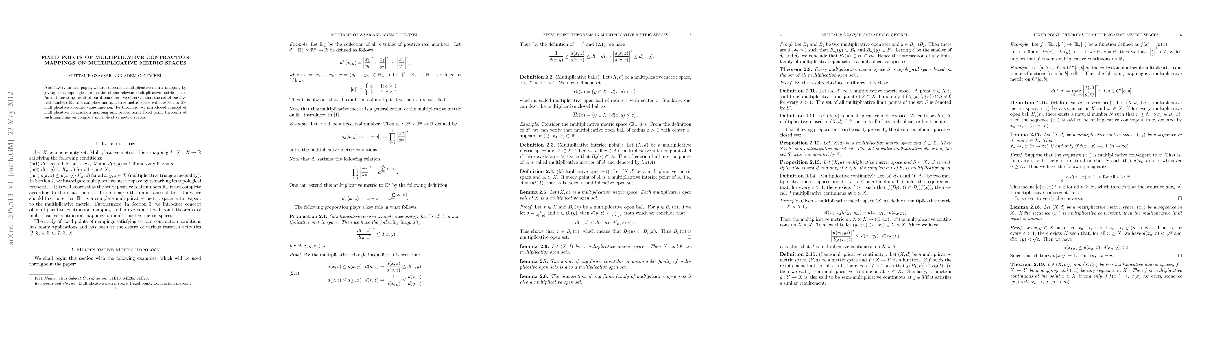 This paper explores multiplicative metric spaces, proving that $\mathbb{R}_+$ is a complete space under the multiplicative absolute value. It introduces multiplicative contraction mappings and establishes fixed point theorems for these mappings in complete multiplicative metric spaces.