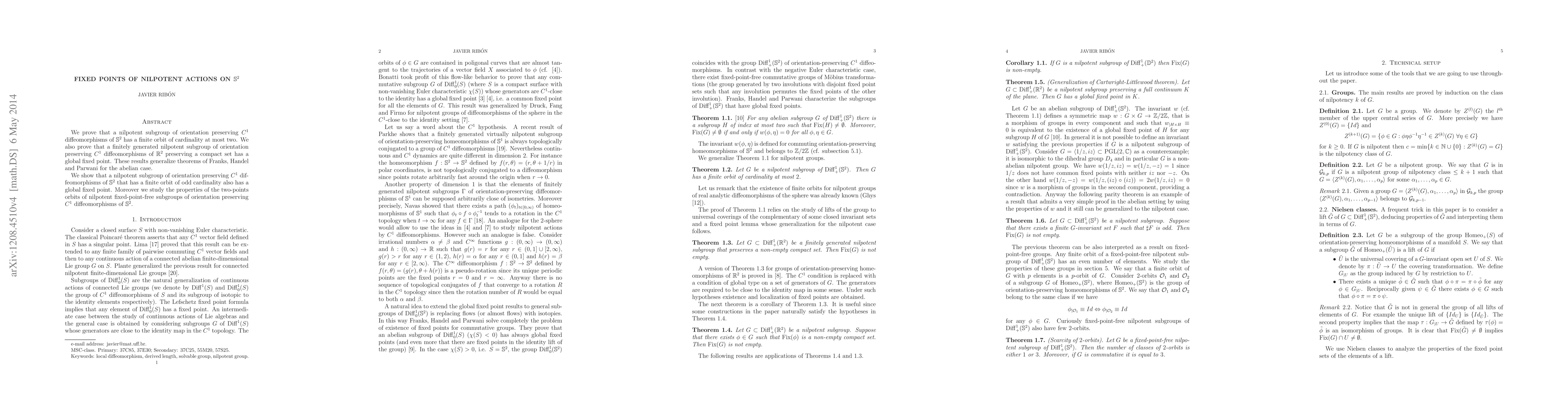 We prove that a nilpotent subgroup of orientation preserving $C^{1}$ diffeomorphisms of ${\mathbb S}^{2}$ has a finite orbit of cardinality at most two. We also prove that a finitely generated nilpotent subgroup of orientation preserving $C^{1}$ diffeomorphisms of ${\mathbb R}^{2}$ preserving a compact set has a global fixed point. These results generalize theorems of Franks, Handel and Parwani for the abelian case. We show that a nilpotent subgroup of orientation preserving $C^{1}$ diffeomorphisms of ${\mathbb S}^{2}$ that has a finite orbit of odd cardinality also has a global fixed point. Moreover we study the properties of the two-points orbits of nilpotent fixed-point-free subgroups of orientation preserving $C^{1}$ diffeomorphisms of ${\mathbb S}^{2}$.
