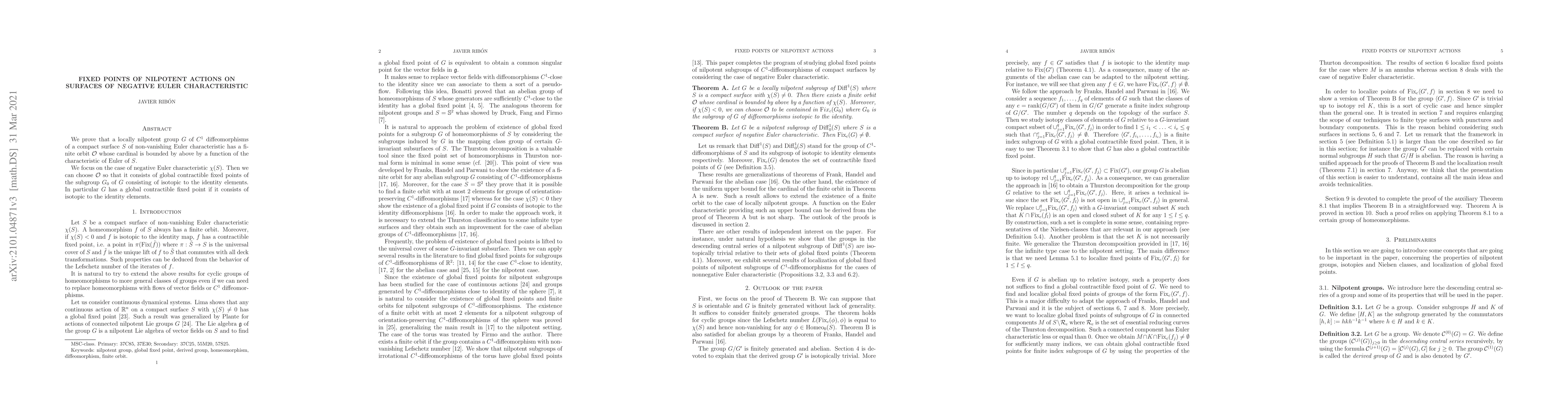 We prove that a locally nilpotent group $G$ of $C^{1}$ diffeomorphisms of a compact surface $S$ of non-vanishing Euler characteristic has a finite orbit ${\mathcal O}$ whose cardinal is bounded by above by a function of the characteristic of Euler of $S$. We focus on the case of negative Euler characteristic $\chi (S)$. Then we can choose ${\mathcal O}$ so that it consists of global contractible fixed points of thesubgroup $G_0$ of $G$ consisting of isotopic to the identity elements. In particular $G$ has a global contractible fixed point if it consists of isotopic to the identity elements.
