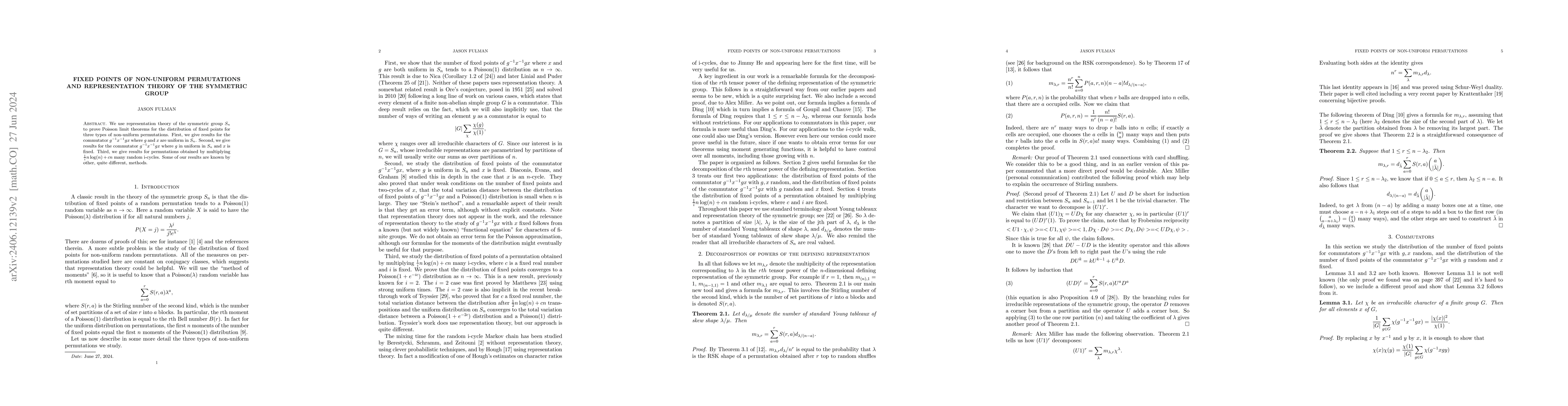 We use representation theory of the symmetric group S_n to prove Poisson limit theorems for the distribution of fixed points for three types of non-uniform permutations. First, we give results for the commutator of g and x where g and x are uniform in S_n. Second, we give results for the commutator of g and x where g in uniform in S_n and x is fixed. Third, we give results for permutations obtained by multiplying n*log(n)/i + cn many random i-cycles. Some of our results are known by other, quite different, methods.