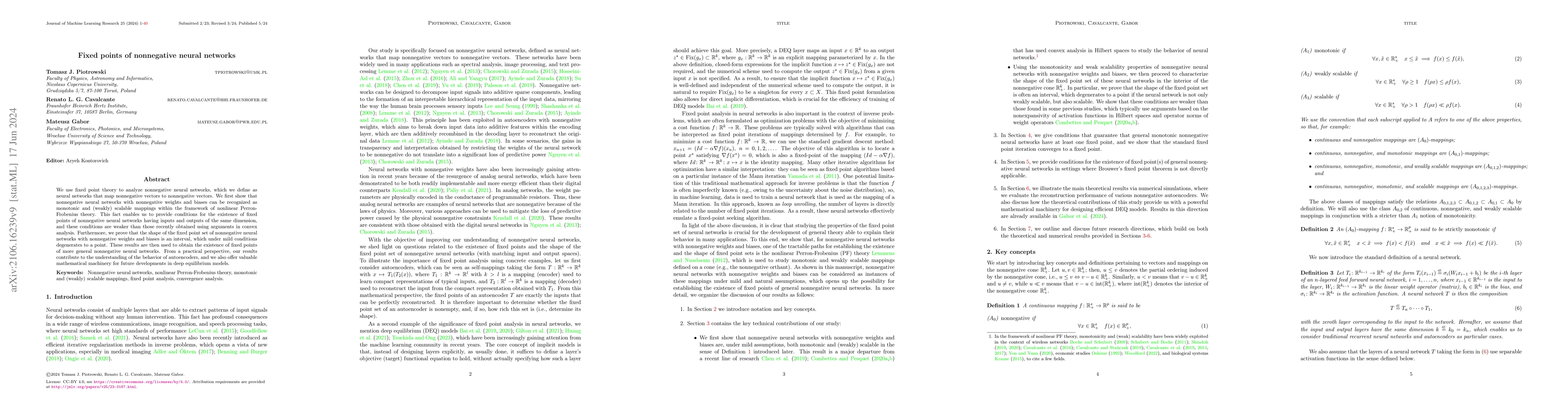 This paper uses fixed point theory to analyze nonnegative neural networks, showing they can be recognized as monotonic and scalable mappings. It provides weaker conditions for fixed point existence compared to previous convex analysis methods, and proves that their fixed point sets are intervals that often degenerate to a point, contributing to the understanding of autoencoders and deep equilibrium models.