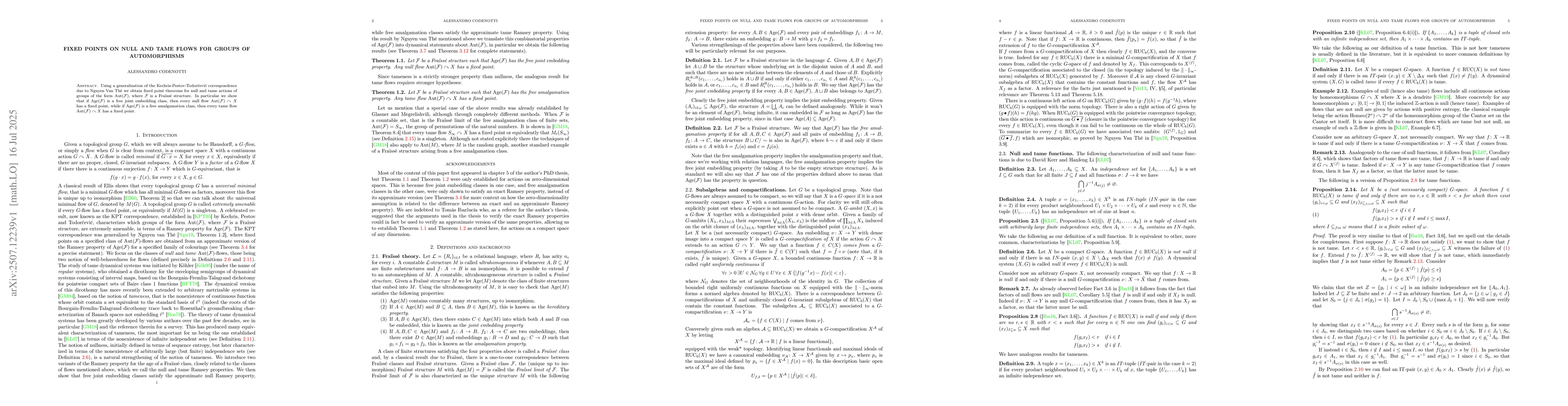 Using a generalization of the Kechris-Pestov-Todor\v{c}evi\'{c} correspondence due to Nguyen Van Th\'{e} we obtain fixed point theorems for null and tame actions of groups of the form $\mathrm{Aut}(\mathcal F)$, where $\mathcal{F}$ is a Fra\"{i}ss\'{e} structure. In particular we show that if $\mathrm{Age}(\mathcal F)$ is a free joint embedding class, then every null flow $\mathrm{Aut}(\mathcal F)\curvearrowright X$ has a fixed point, while if $\mathrm{Age}(\mathcal F)$ is a free amalgamation class, then every tame flow $\mathrm{Aut}(\mathcal F)\curvearrowright X$ has a fixed point.