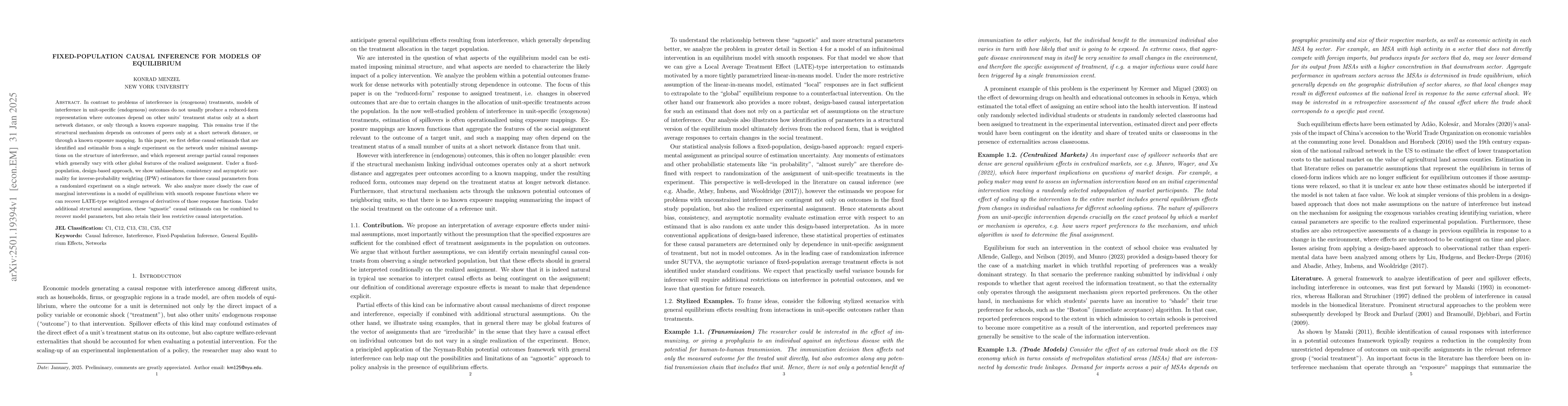 This paper defines causal estimands for fixed-population models of equilibrium with endogenous interference, showing unbiasedness and consistency of inverse-probability weighting estimators. It also explores marginal interventions and recovers LATE-type averages of response function derivatives under additional structural assumptions.